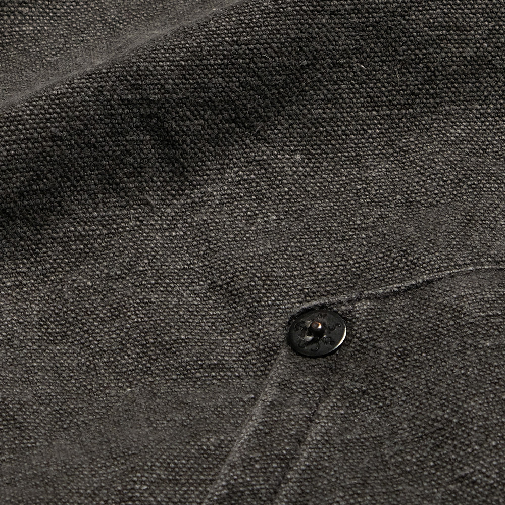タテ糸にコットン、ヨコ糸にヘンプの太番手を使用し、高密度に織ったヘビー・オックスフォード。日本の伝統的な染料、墨にて染めあげ、仕上げでテンションを掛けずに何度も洗い込んで膨らみを持たせています。