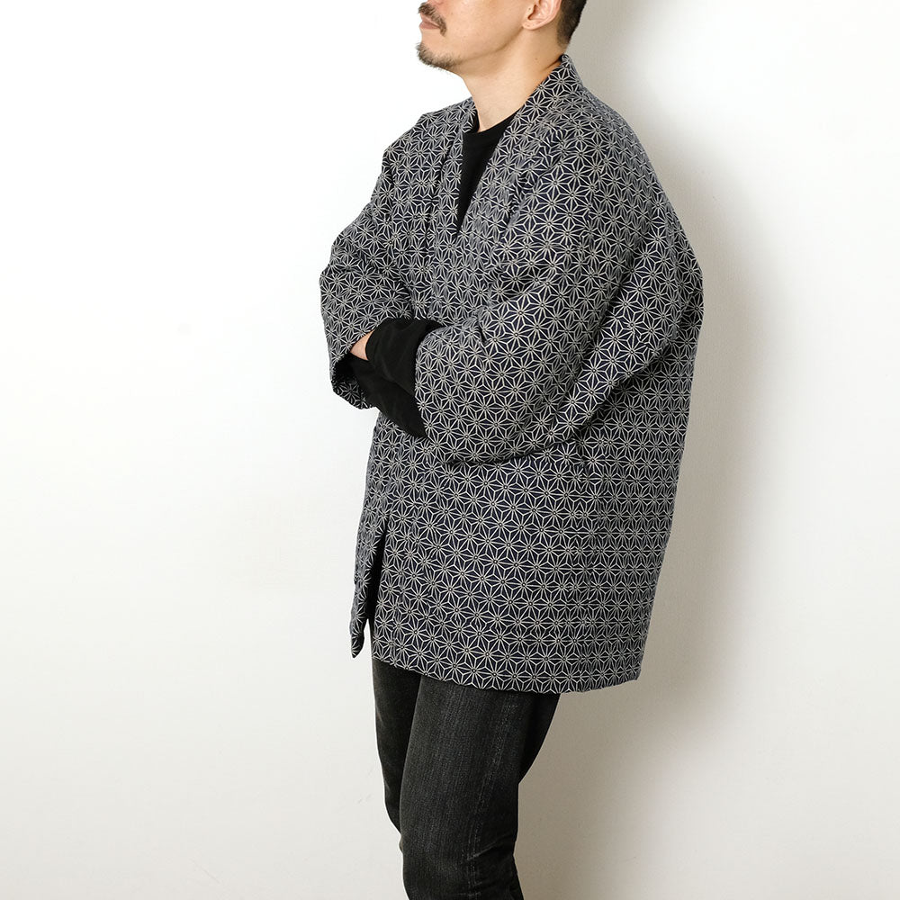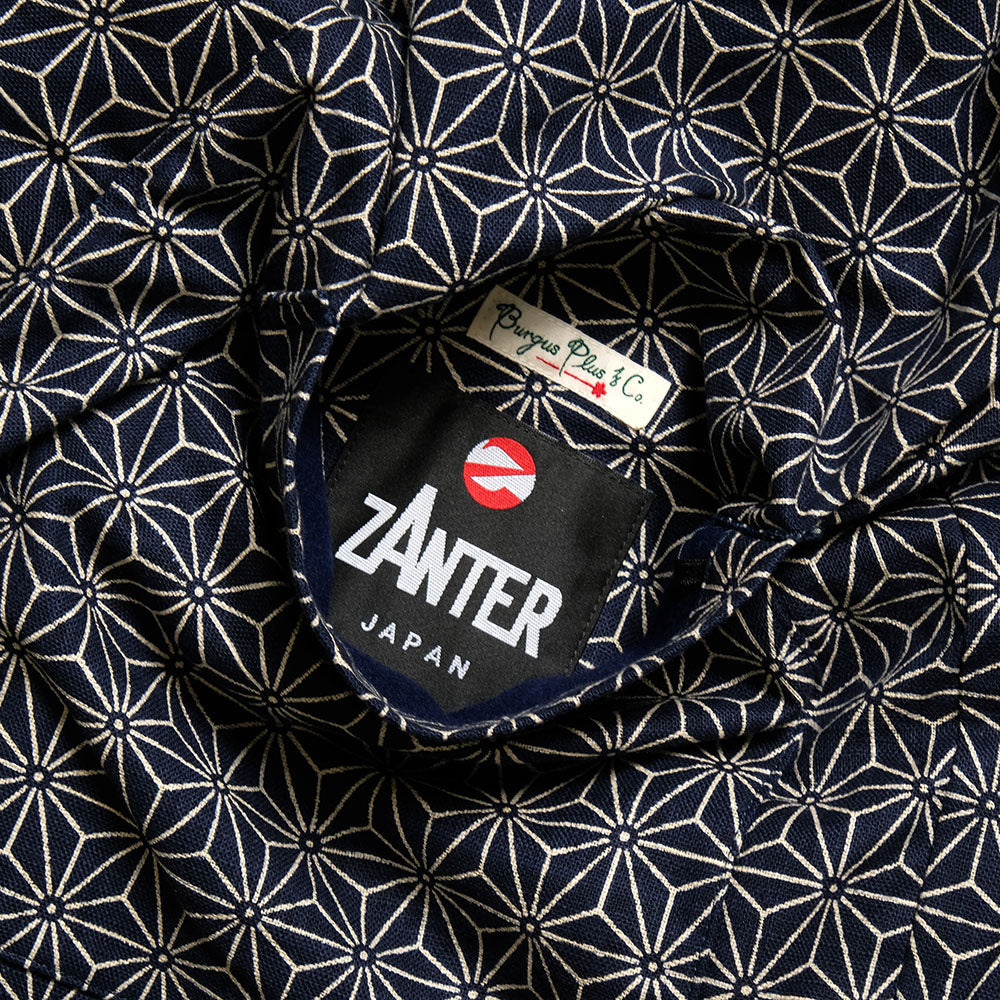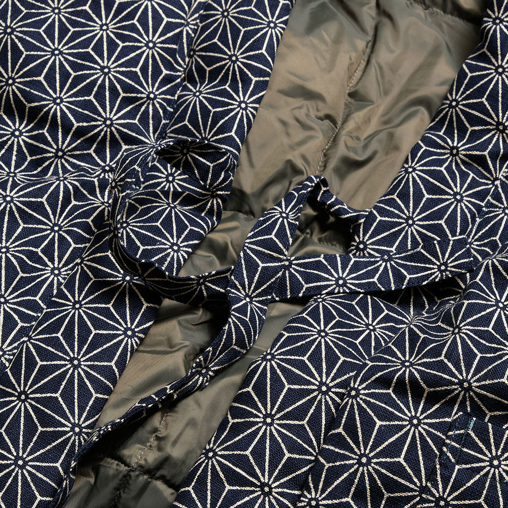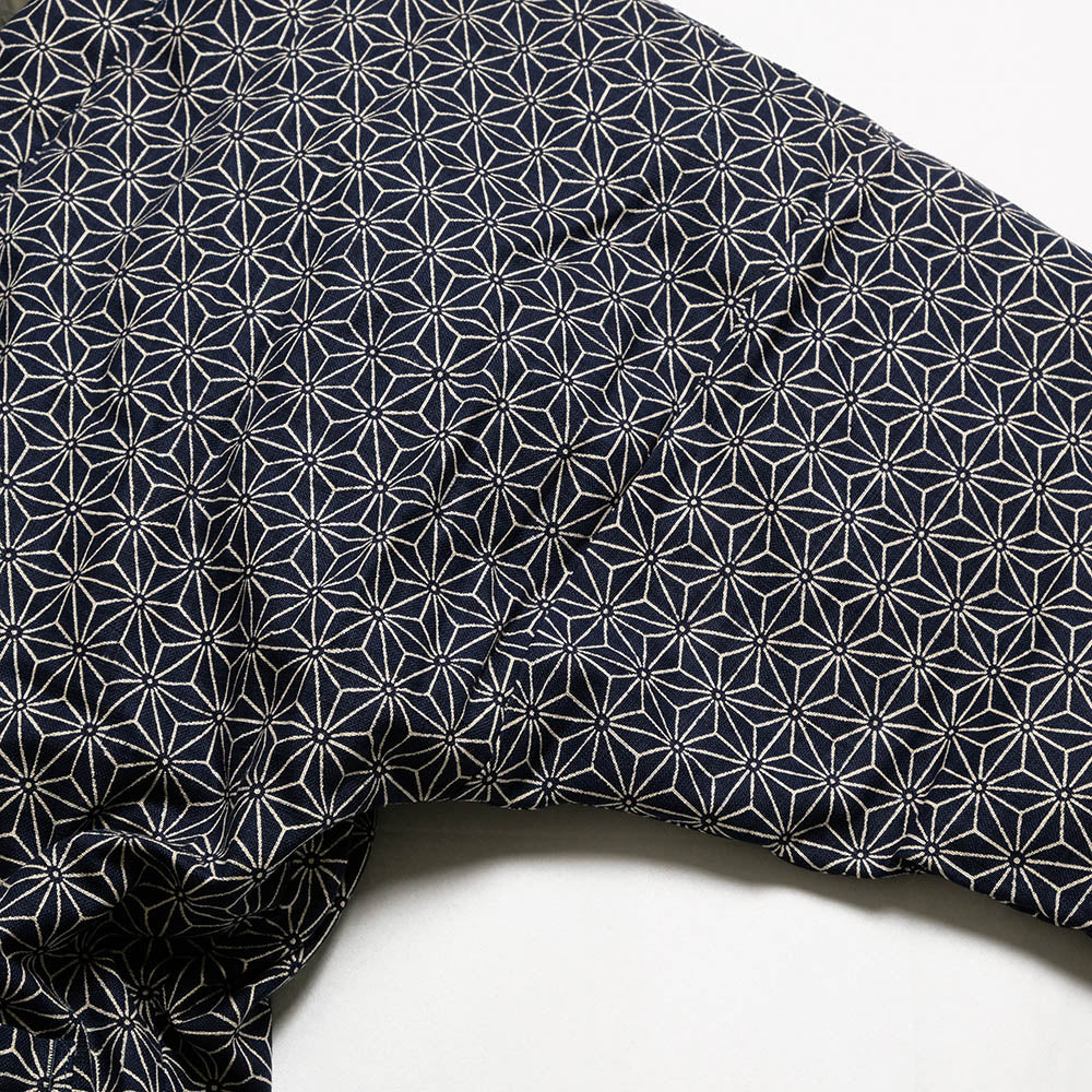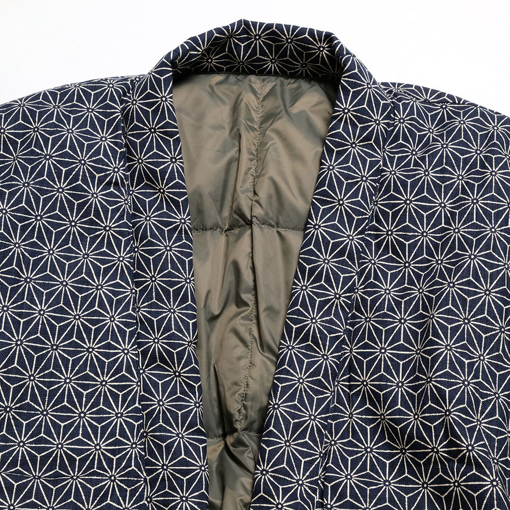南極観測隊など多くの遠征隊を支えた日本におけるダウンウェアのパイオニア【ZANTER(ザンター)】とのコラボレーションアイテム。日本の伝統的な防寒着『半天』に真綿ではなくダウンを合わせたユニークな一着。表地は着物などで使われる「つむぎ」をシルクではなくコットンで再現した平織素材。不規則な太い節が魅力のこの生地は非常に柔らかく肌触りが良いため、「ちゃんちゃんこ」や「風呂敷」など日本の生活の中で昔から使用されている素材です。 今回の柄は「麻の葉」を抜染プリントで表現。中わたはもちろんザンターが誇るダウン。黄金比と呼ばれるダウン90% フェザー10%の配合。ダウンだけではコシが無くなり、フェザーが多くなるとふんわり感が無くなります。長年ダウン製品を手掛けて、ダウンの特性を知り尽くしたザンターならではの技術の妙が光ります。サイズは1サイズのみとなりますが、半天らしくワイドなシルエットのため多くの方に馴染むデザインなはず。室内はもとより、お出かけにもちょっとした散歩にも。これ以上のリラックスウェアはあるでしょうか?