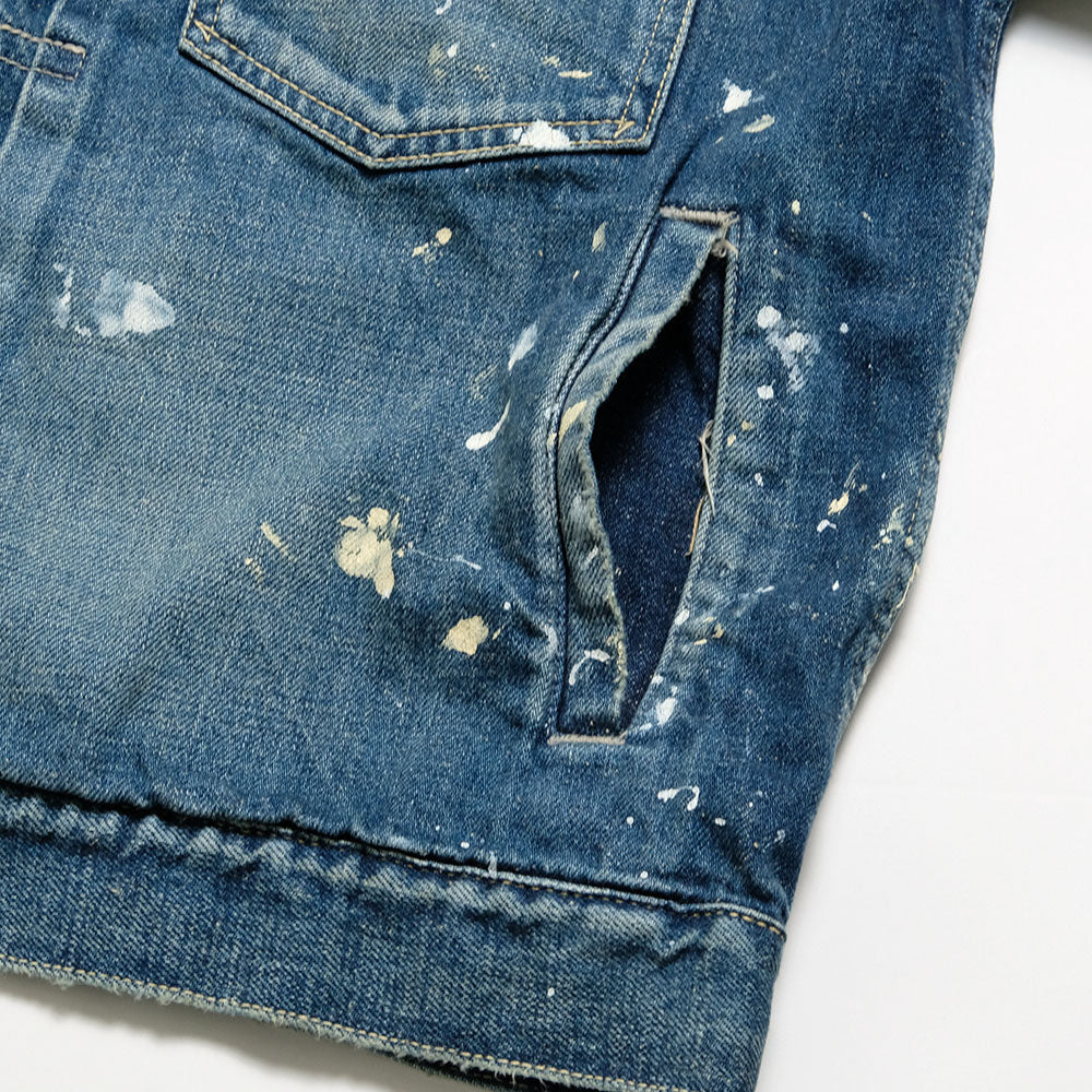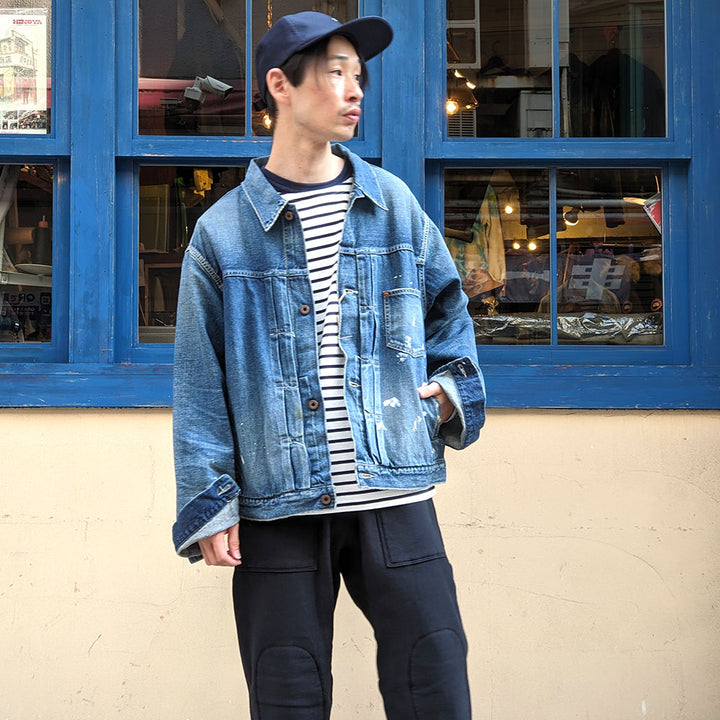 最高級スビン綿を通常のスビン綿と混ぜて作ったオリジナルのデニム生地。タテ糸7番×ヨコ糸9番の糸をシャトル織機で織り上げた11.5オンスのセルビッジデニムは、落ちワタのムラ感やネップが特徴的で、スビン綿ならではの滑りや肌触りに優れた素材である。今回のデニムジャケットは大戦モデルと呼ばれる、第二次世界大戦中の物資統制に基づいたディテールを採用。ヴィンテージでは大きいサイズにだけみられる、希少価値の高い背中心の接ぎ(スプリットバック)のディテールを取り入れている。オリジナルにはないハンドウォームポケットを配備し、より現代的なスタイルで着られるようアップデートした。