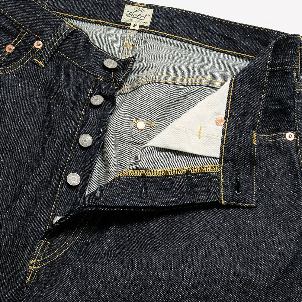 腰回りやワタリを広めにとったワイドストレートモデル。最高級スビン綿と、スビン綿を紡績する際に出る落ちワタを混ぜて作ったオリジナルのデニム生地。タテ糸7番×ヨコ糸9番の糸をシャトル織機で織り上げた11.5オンスのセルビッジデニム。落ちワタのムラ感やネップが特徴的で、スビン綿ならではの滑りや肌触りに優れた素材です。形は5ポケットデニムの完成形と言われる1947年モデルをベースにしています。コインポケット口やサイドシームのセルビッジ使いや隠しリベット、縫製の仕方もヴィンテージ仕様に。