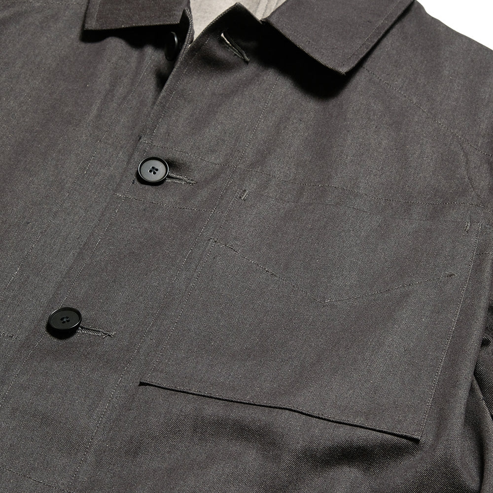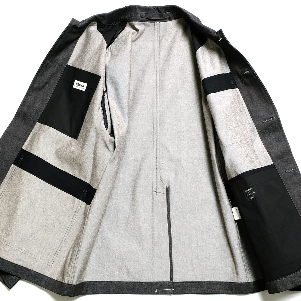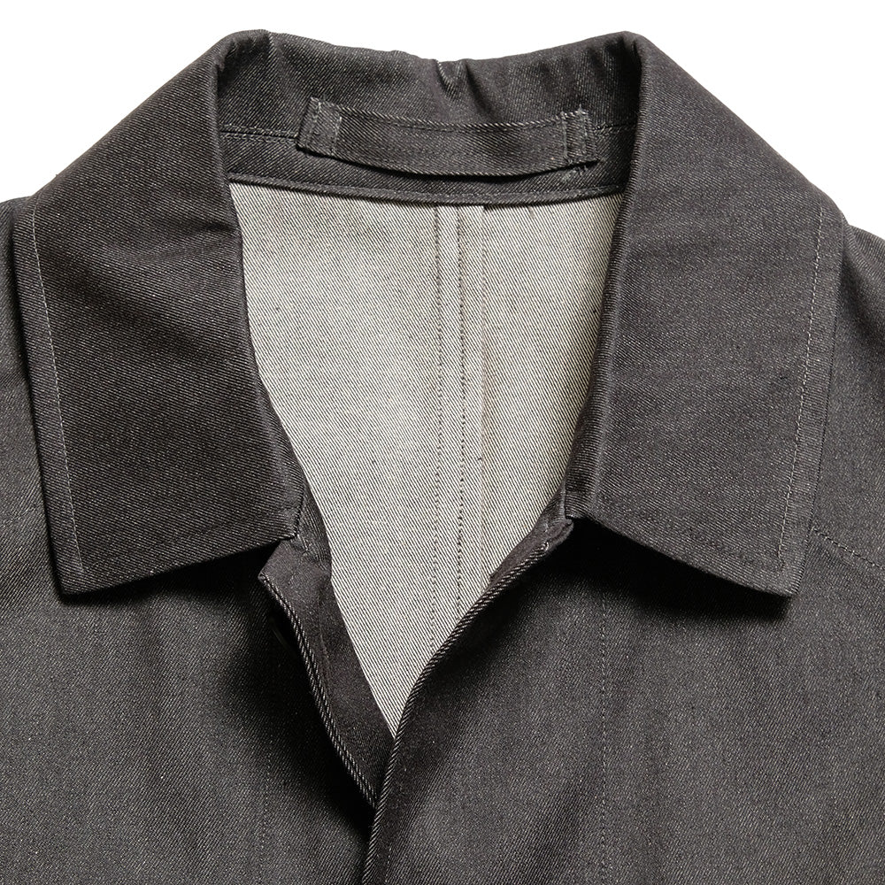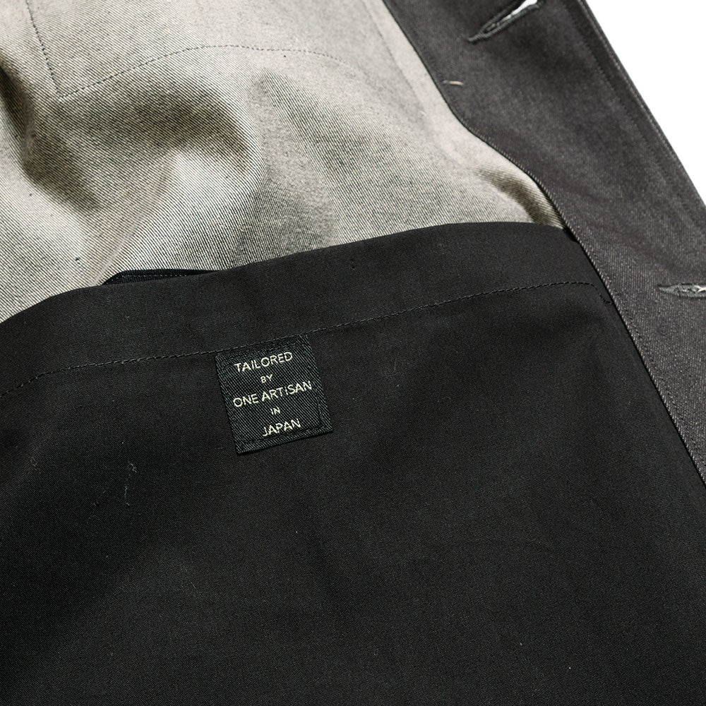 30-40年代の仕立て屋にて製作されたテイラードカバーオール。これを「裁断から縫製・仕上げまで」一人の熟練職人により製作していく丸縫いによって、再現したのがこちらのモデル「ENVE」。デザイン自体はフレンチワークのカバーオールをベースに、襟に立体感と存在感を持たせ、センターベントを加えるなど、テーラードジャケットのように着られるのが特徴です。また、肩や肘には補強を施したり、スクエア状の胸・腰ポケット、内ポケットが設けられており収納面でも抜群。ワークジャケットの要素も楽しめる一着です。生地には8ozのウエストポイントデニムを採用。細番手の糸を高密度に織り上げた生地は、ライトオンスながらハリと芯を感じる質感。高密度織りならではの美しい光沢感も良いですが、洗濯と着用を繰り返すことで生じる風合いの変化も楽しみなジャケットです。