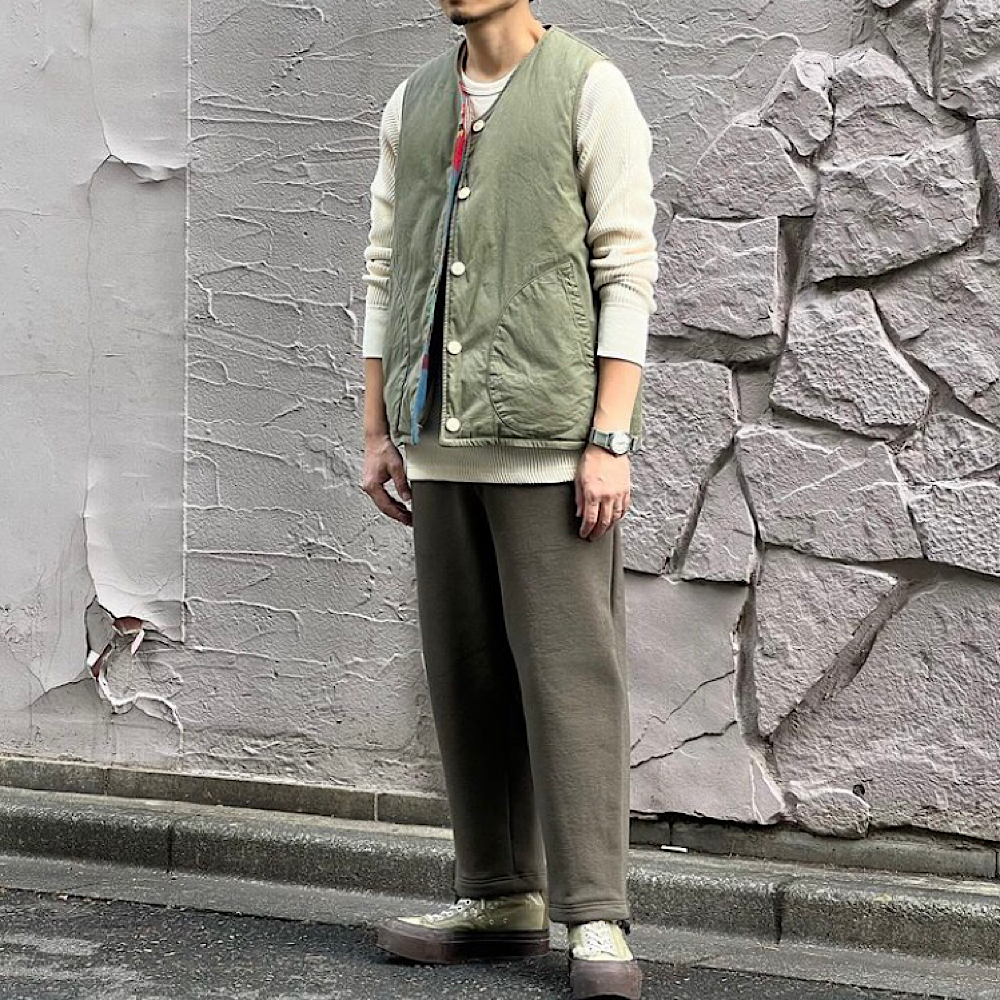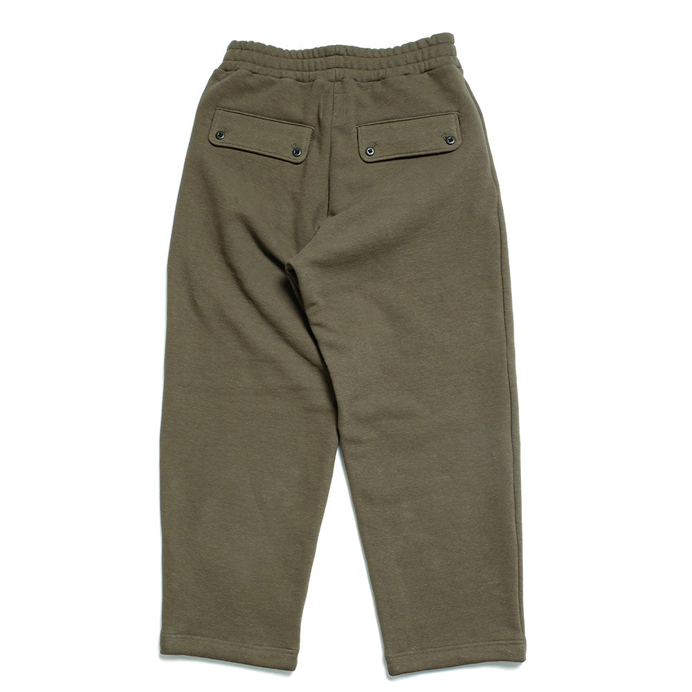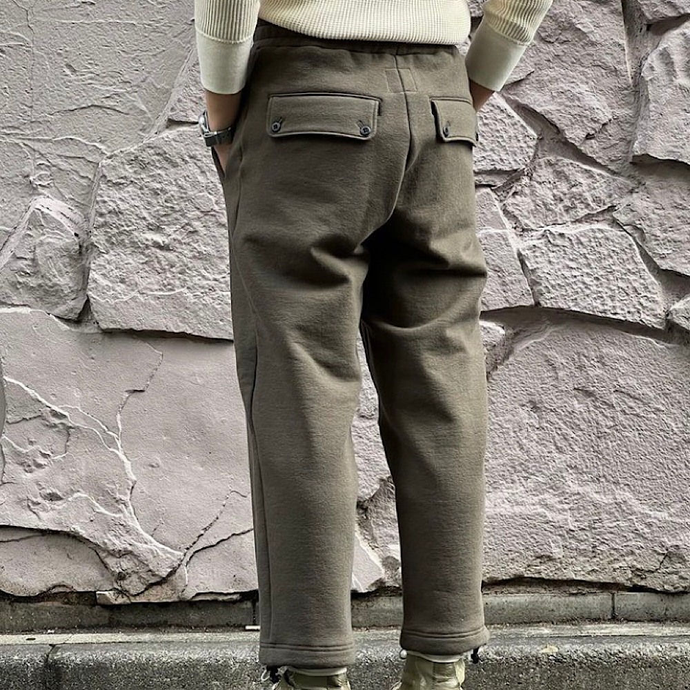 表糸と中糸にポリウレタンをカバーリングした糸を使用し、ストレッチ性をもたせた裏起毛スウェットパンツ。希少編み機である、アズマ編み機を使用。ポリウレタンの縮む力を利用して度詰めしたかのような特徴的な凝縮感を出しました。