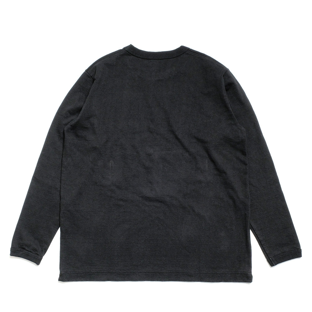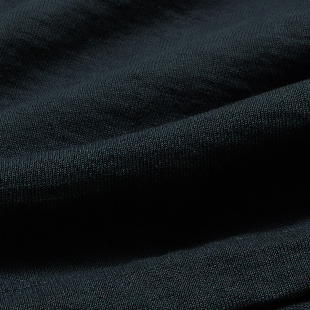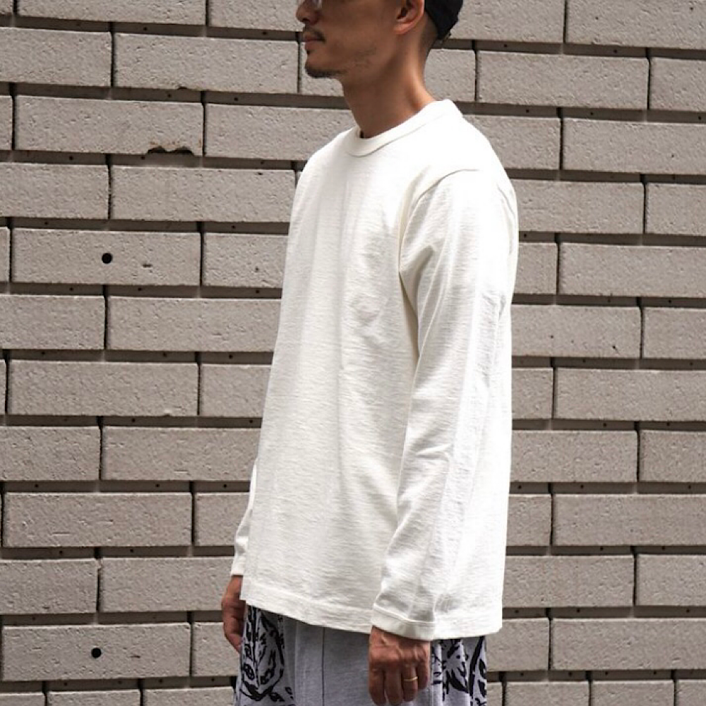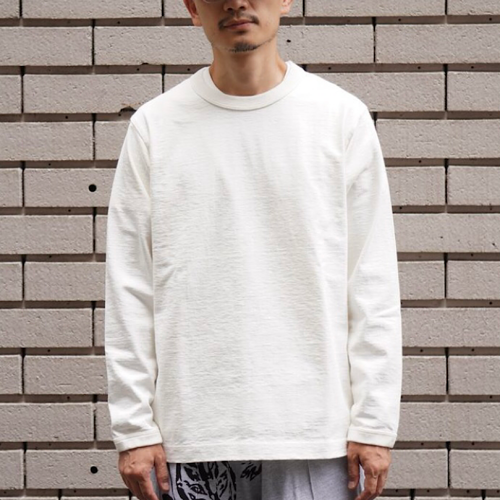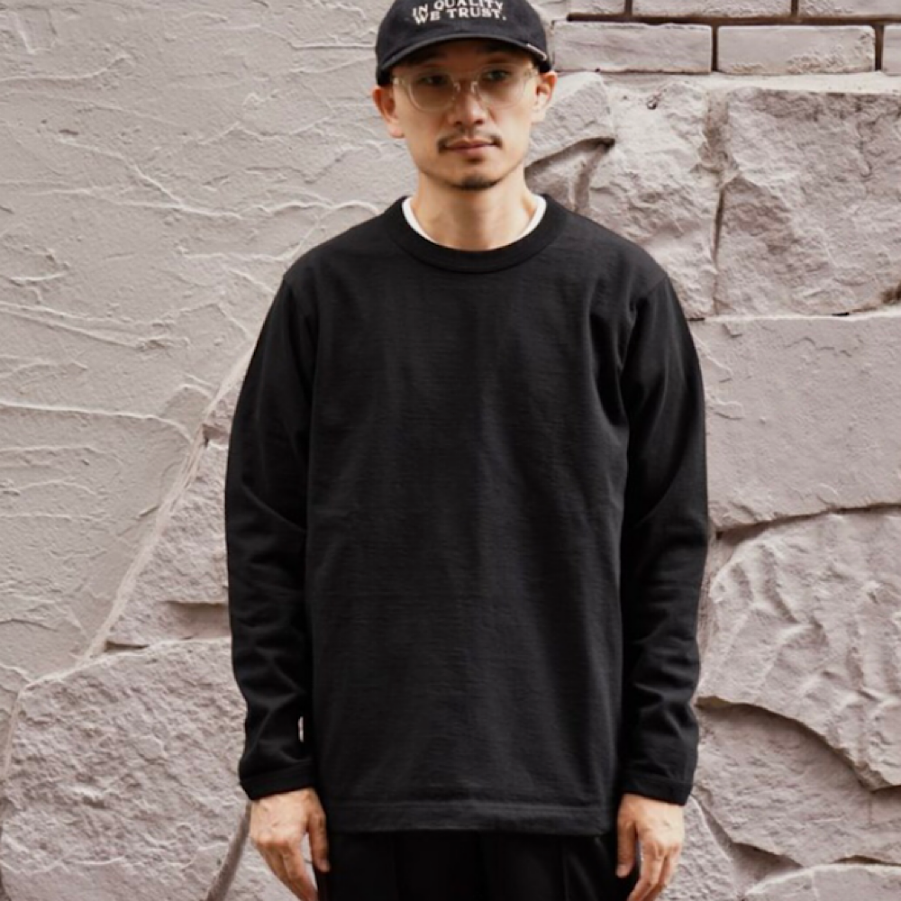アメリカ産コットンを吊り編み機を使用し、極限まで度目を詰めて編み立てたドツメ天竺素材の長袖Tシャツ。吊り編み機でゆっくり編み立てることで均等に度目が詰まり、着用と洗濯を繰り返しても縮みやゆがみが起こりにくくなっています。約11.5オンスとTシャツとは思えないほど重量感があり、透けない、汗染みが目立ちにくいといった安心感もあります。首リブは耐久性に優れたバインダーネックを採用。