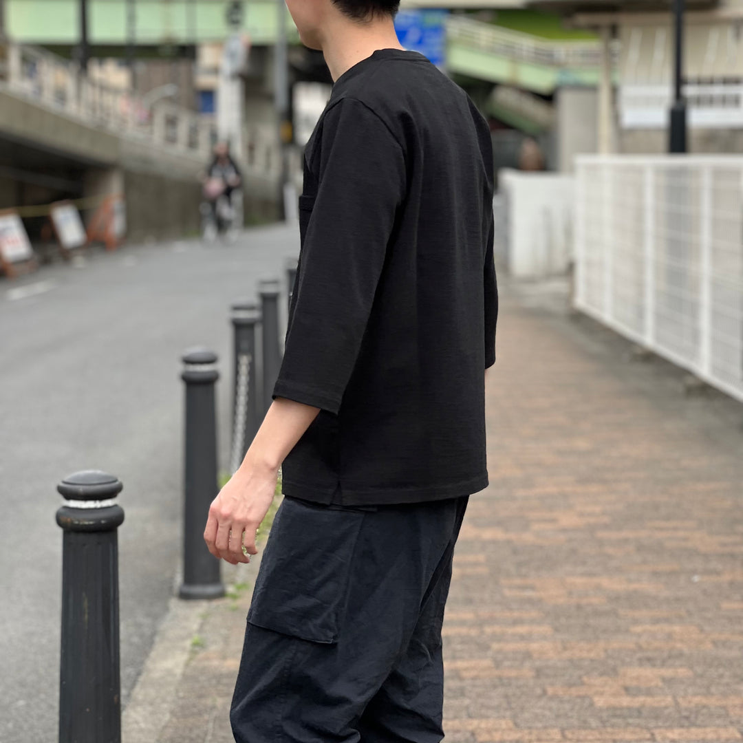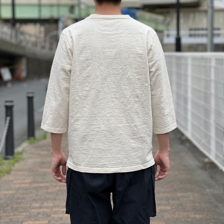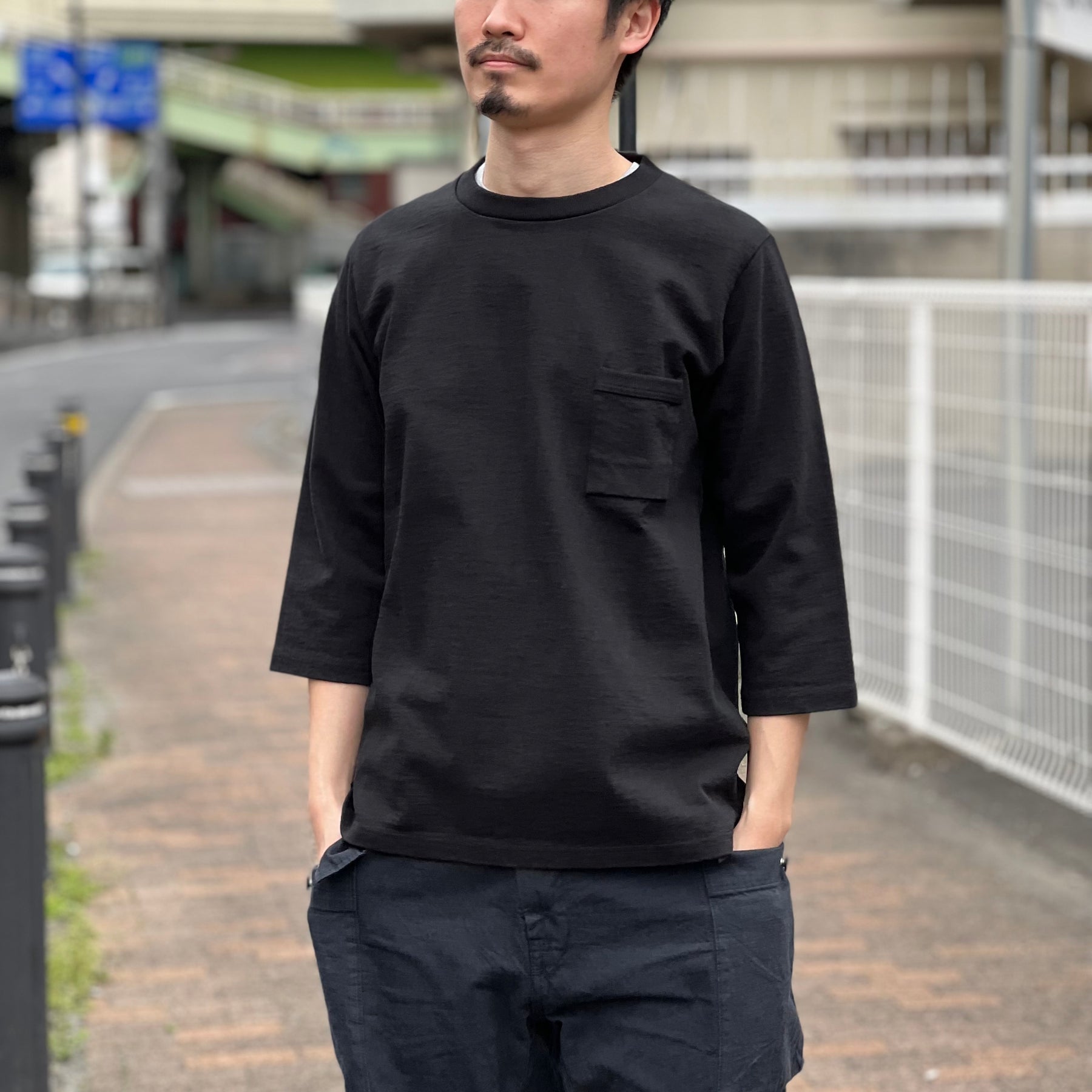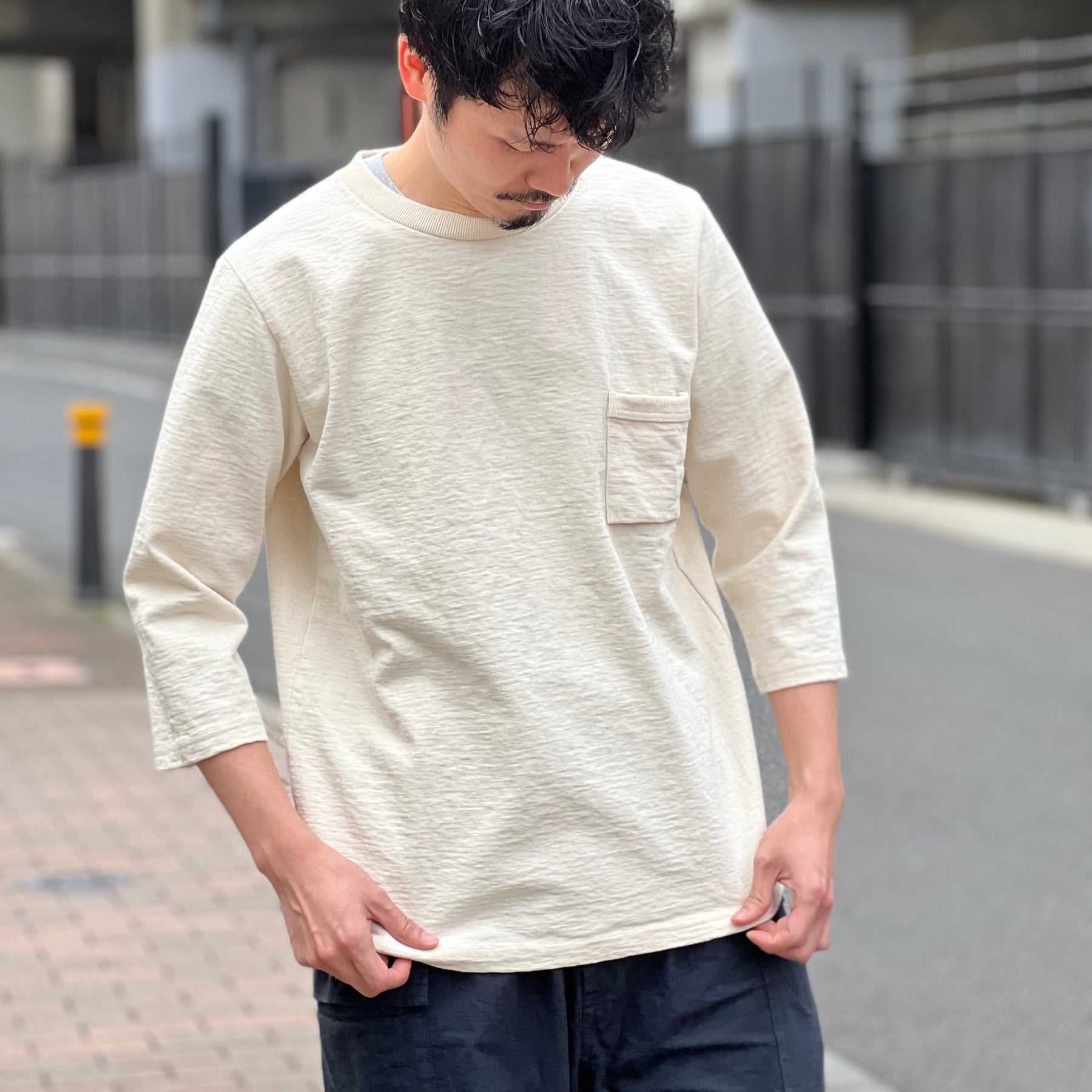 吊り編み機で編立て、さらに極限まで度詰めした生地を使用したスウェットのような5分袖Tシャツ。耐久性のあるしっかりした生地であるだけでなく、生地表面の凹凸感も特徴的です。ポケットは手の込んだマチ付きの仕様で、縁はリブバインダーで補強されています。