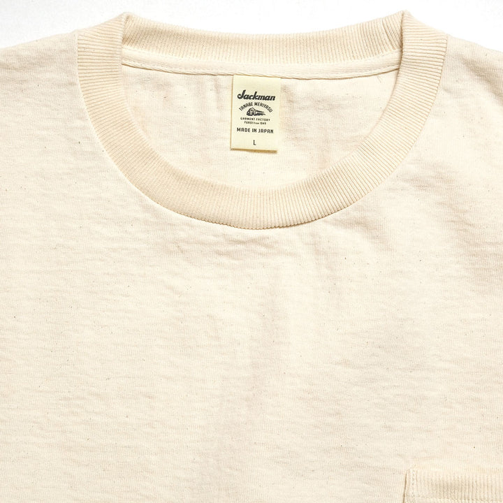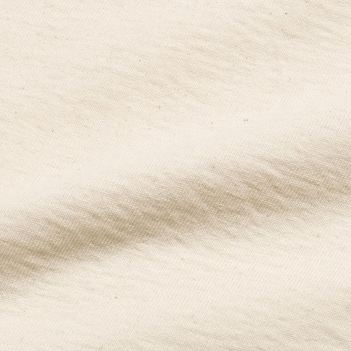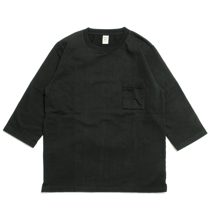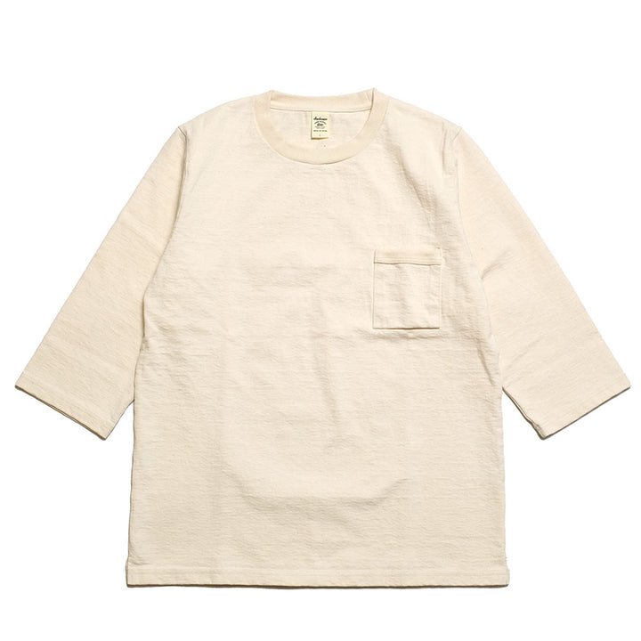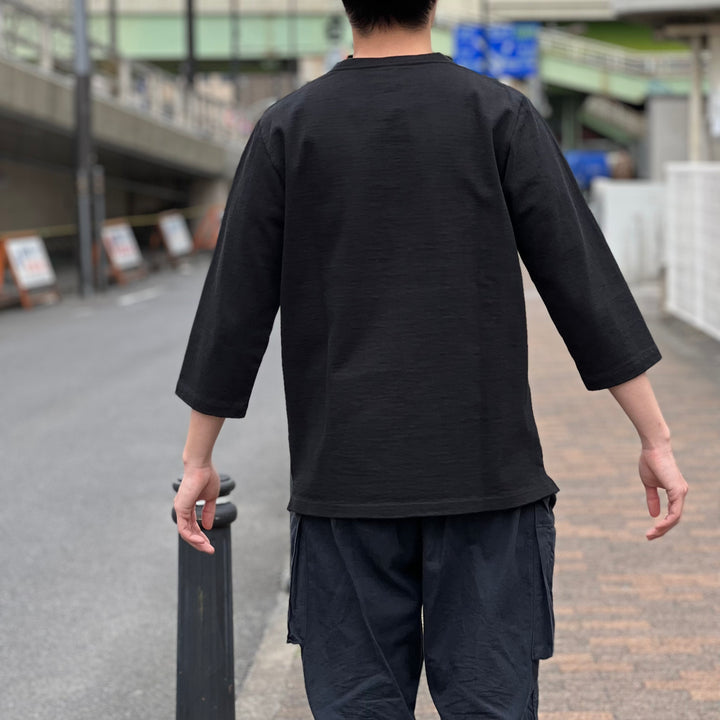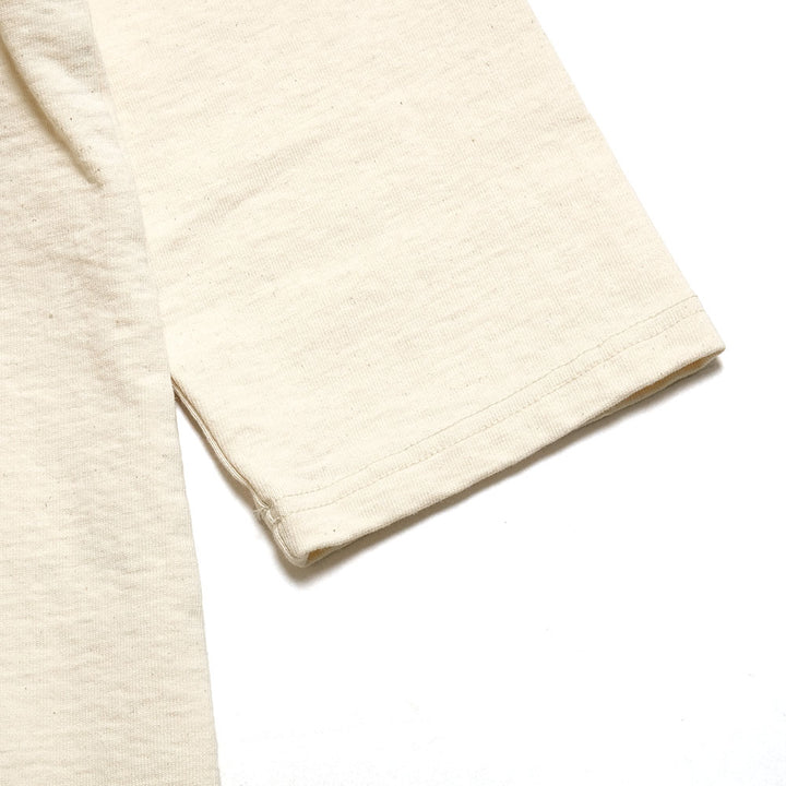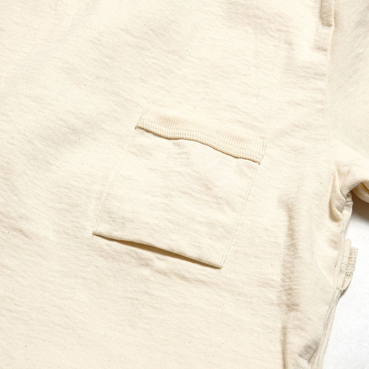 吊り編み機で編立て、さらに極限まで度詰めした生地を使用したスウェットのような5分袖Tシャツ。耐久性のあるしっかりした生地であるだけでなく、生地表面の凹凸感も特徴的です。ポケットは手の込んだマチ付きの仕様で、縁はリブバインダーで補強されています。