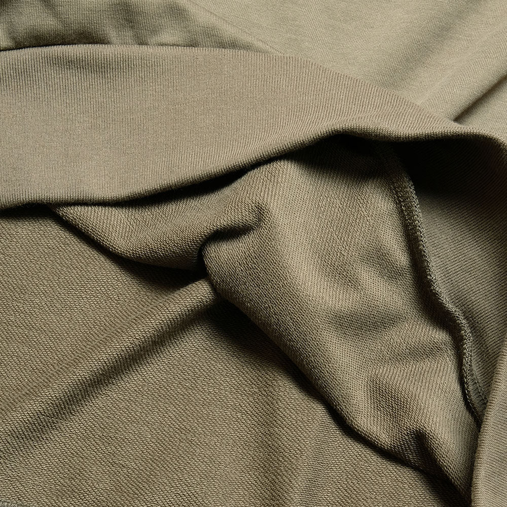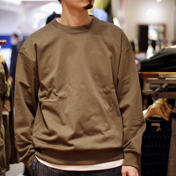 スペイン産の上質なピマコットンを高密度に編み立てたクルーネックスウェット。極細の糸を使用し、薄手で軽量かつ糸本来の持つ滑らかさ・柔らかさによる着心地の良さが特徴。スウェットとは思えないほど薄手ですが、高密度で編み立てることで型くずれが起こりにくく、コットンなので家庭洗濯も容易です。袖付けは手の込んだ前セットイン - 後ろラグランスリーブ仕様で肩のラインになじみやすく、腕を動かしやすいカッティングを採用しています。