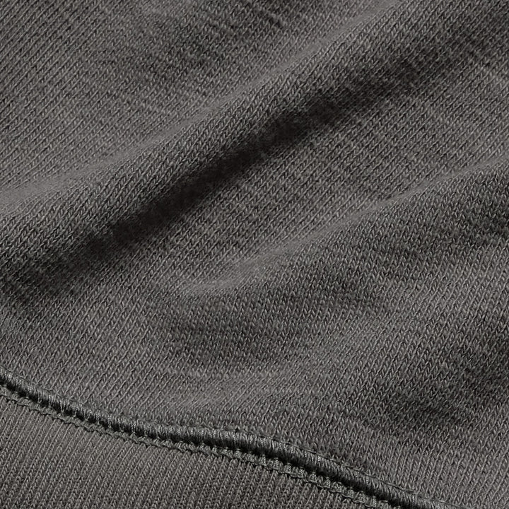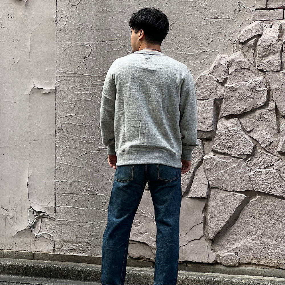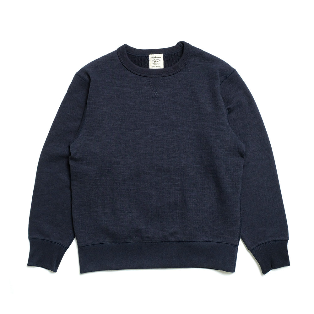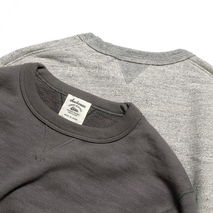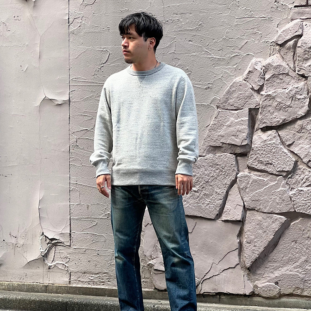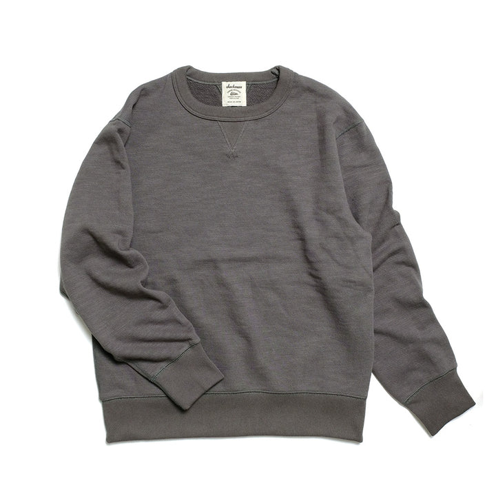 太番手の国産糸を使用した柔らかさと肉厚感があるスウェットクルーネックシャツ。身巾と肩巾はゆったりとした設計で、肩傾斜を付けることで袖を下げた際の窮屈感を解消。二の腕から袖口にかけてゆとりをもたせており、また前後に配しした首元のガセットは着脱時の伸縮を補助し、首フライスの伸びを防止します。首元、袖口、裾に配したリブも身頃の肉厚感とのバランスを考え2本取りして編み立てることで耐久性を高めました。着用時の快適さを追究した結果、肌に触れる主要部分の縫製は縫い代が平らになり、ごろつき感が少ないフラットシーマを採用。