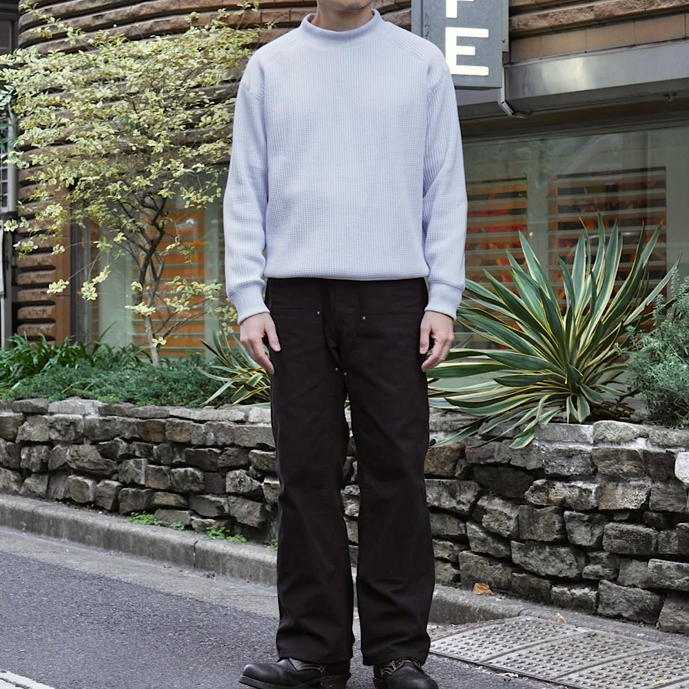 JackmanのWaffle Midneck。肉厚で伸縮性に富んだワッフル生地に針抜きのリブを合わせたクラシカルな一着。首に適度なボリュームができるので、シャツやジャケットのインナーに使った時の収まりが良いです。以前の『JM7200』モデルに比べ、肩幅を広めにとったドロップショルダーのようなシルエット。全体的にサイズ感もゆとりをもたせた作りにリニューアルされています。