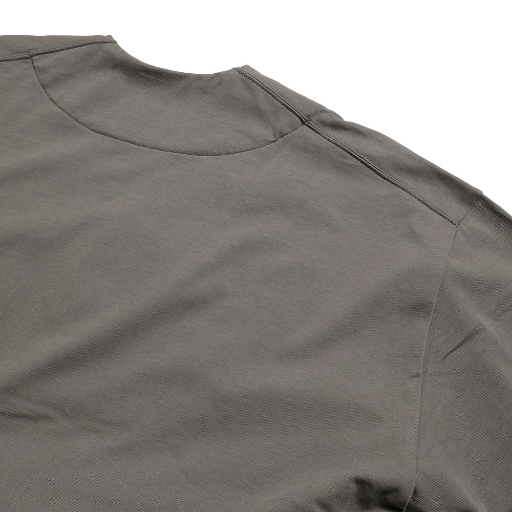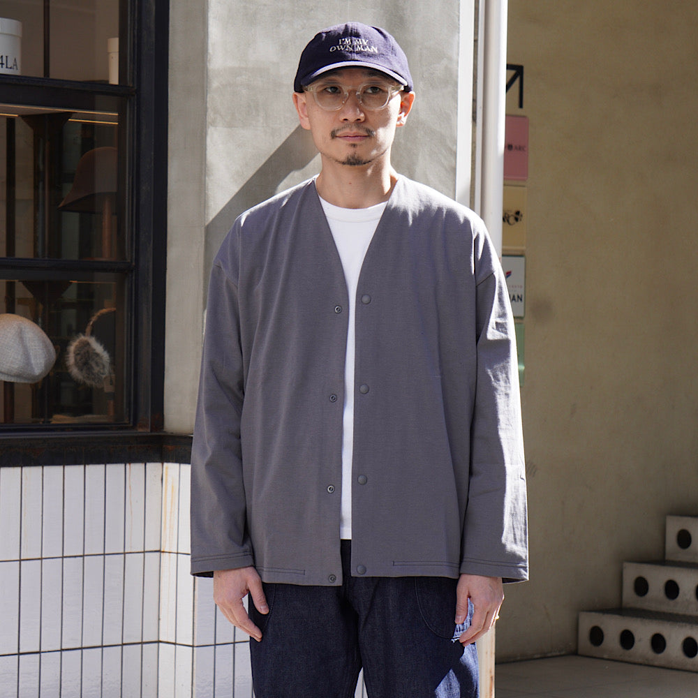 コットン100%とは思えない、シルクのような肌触りと光沢感のカーディガン。高密度に編み立てられた生地にはしっかりしたハリ感があり、表面がフラットで機能素材のようなサラッとした生地はひんやりと冷たさも感じられます。裾の内側のドローコードはシルエットのアレンジとしてだけでなく、動きの中でも裾がめくれ上がらない役割もあります。