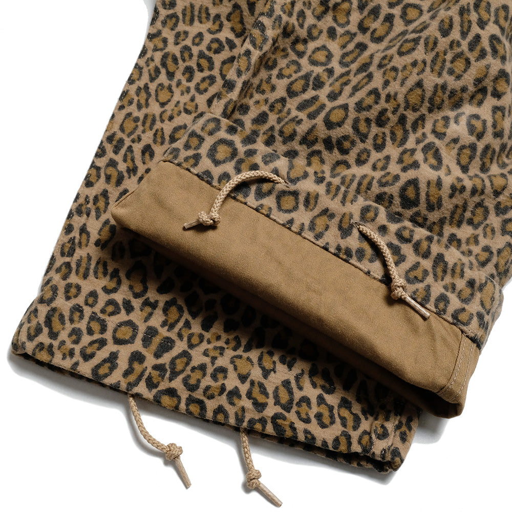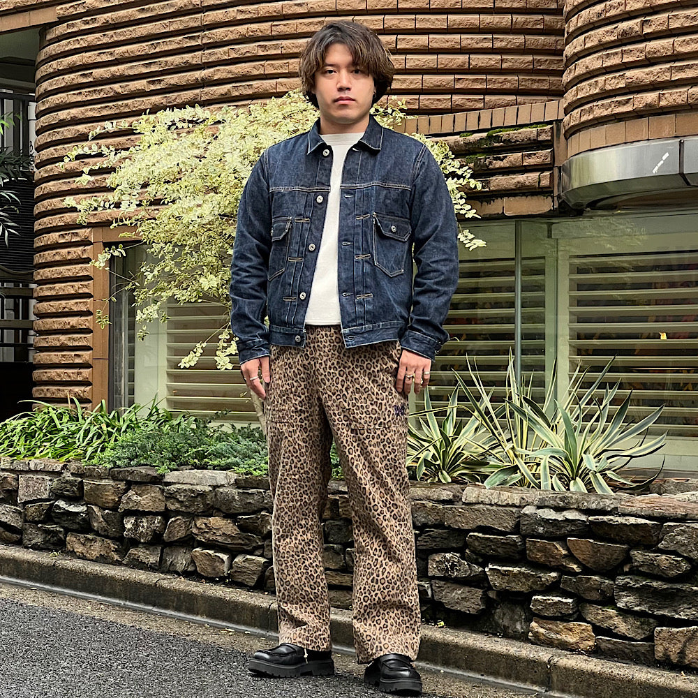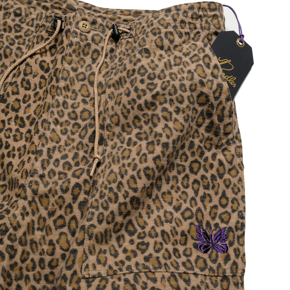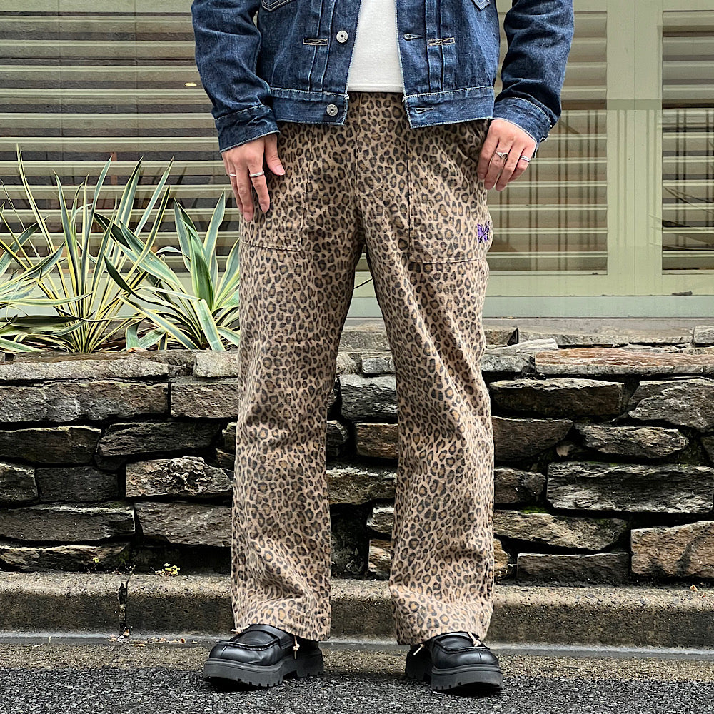 定番アイテムとして展開される、ドローコードウエスト仕様のファティーグパンツ。今季は個性的なレオパード柄でリリース。ブラッシュド加工されたサテン地は肌触りが良く、秋冬らしい温かみを感じる一着。ベーシックな中太のシルエットで、ウエスト部分にはニードルスらしい蝶の刺繍が施されています。