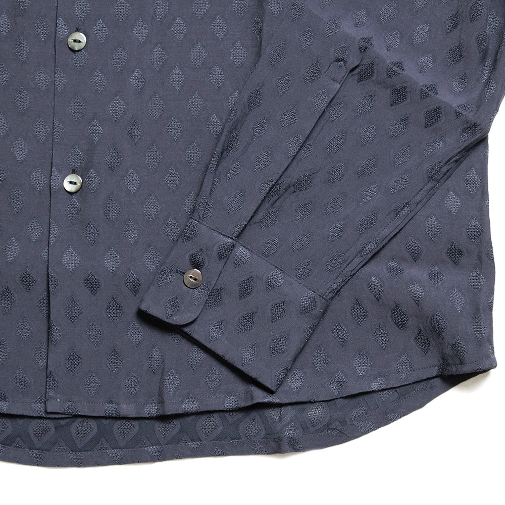 開放的なワンナップカラーにパッチポケット、オーセンティックなスタイルの一着。カジュアルかつベーシックなデザインで、デイリーに活躍するアイテムです。上品な光沢とドレープの落ち感、透け感のあるダイヤモンドメッシュ柄の生地を使用した春夏らしいシャツに仕上がっています。