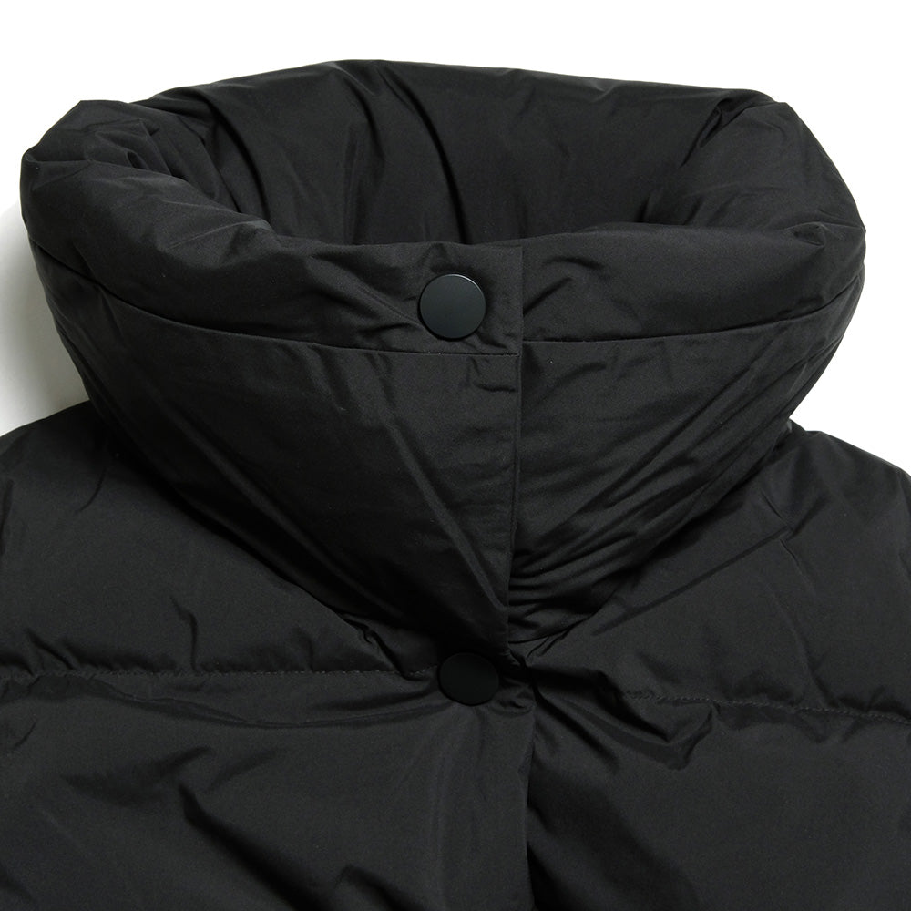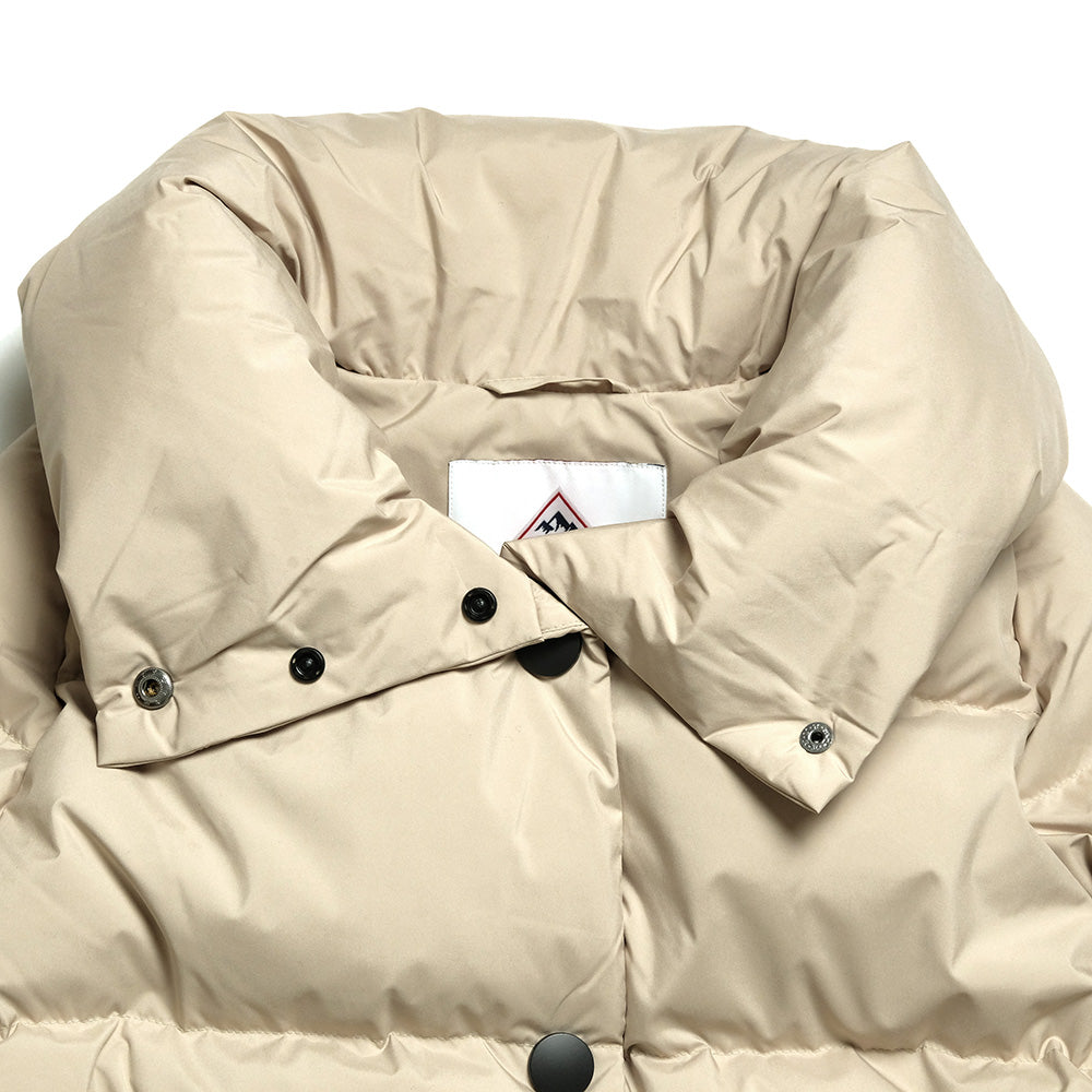 ボリュームのある襟元とフロントのドットボタンがアクセントとなったミドルレングスの「エローラ2」。ややドロップした肩と細すぎない袖幅で全体的にゆとりがあるリラックスしたシルエット。フレンチダックダウンをしっかりと詰め立体的に仕上げた襟は、一番上のボタンを閉じることで襟が立ち上がりマフラー代わりにもなります。また前後差を付けた裾をラウンドさせて全体的に柔らかい印象のダウンジャケットに仕上げています。