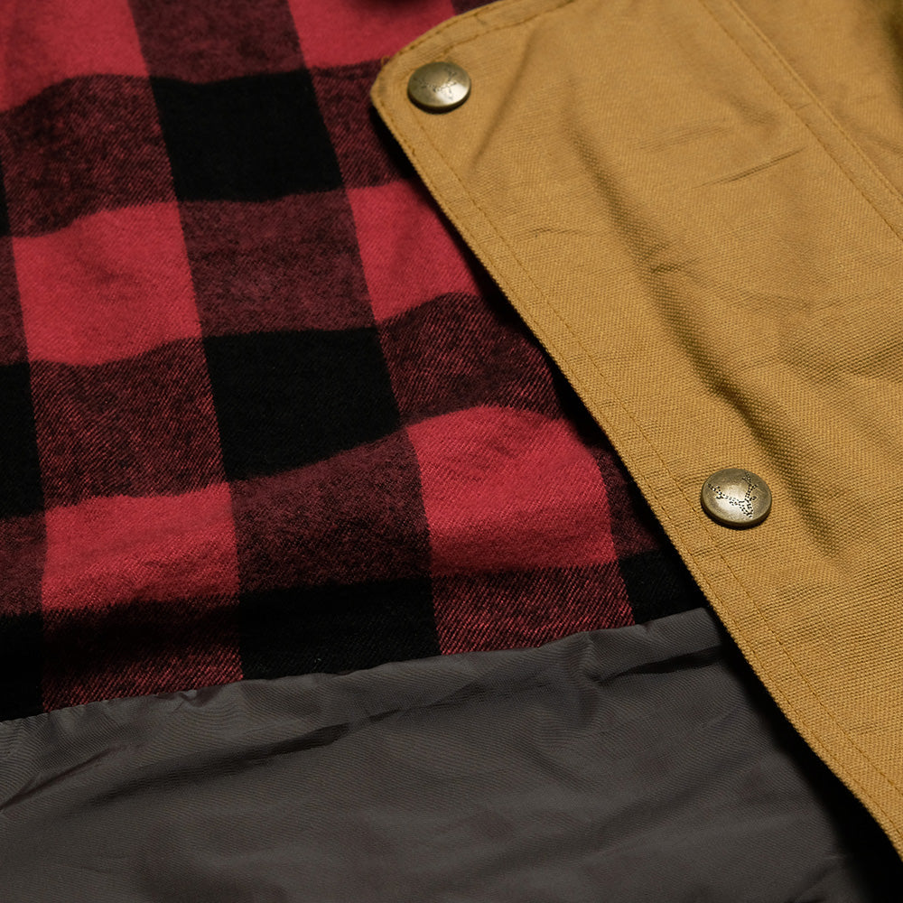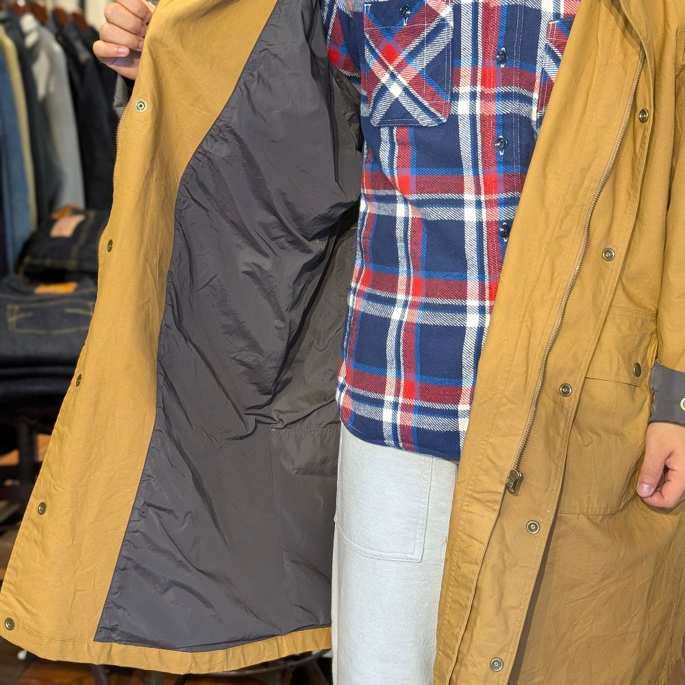 SOUTH2 WEST8 のブランド設立当初より展開されている定番、カーメルジャケットをロング丈のコート型にアレンジしたカーメルコート。余裕のあるワイドシルエットと右胸に斜めに取り付けられたポケットが特徴的です。立ち襟の部分にはフードが収納されており、クラシカルながら機能的なアウトドアのディテールを備えています。