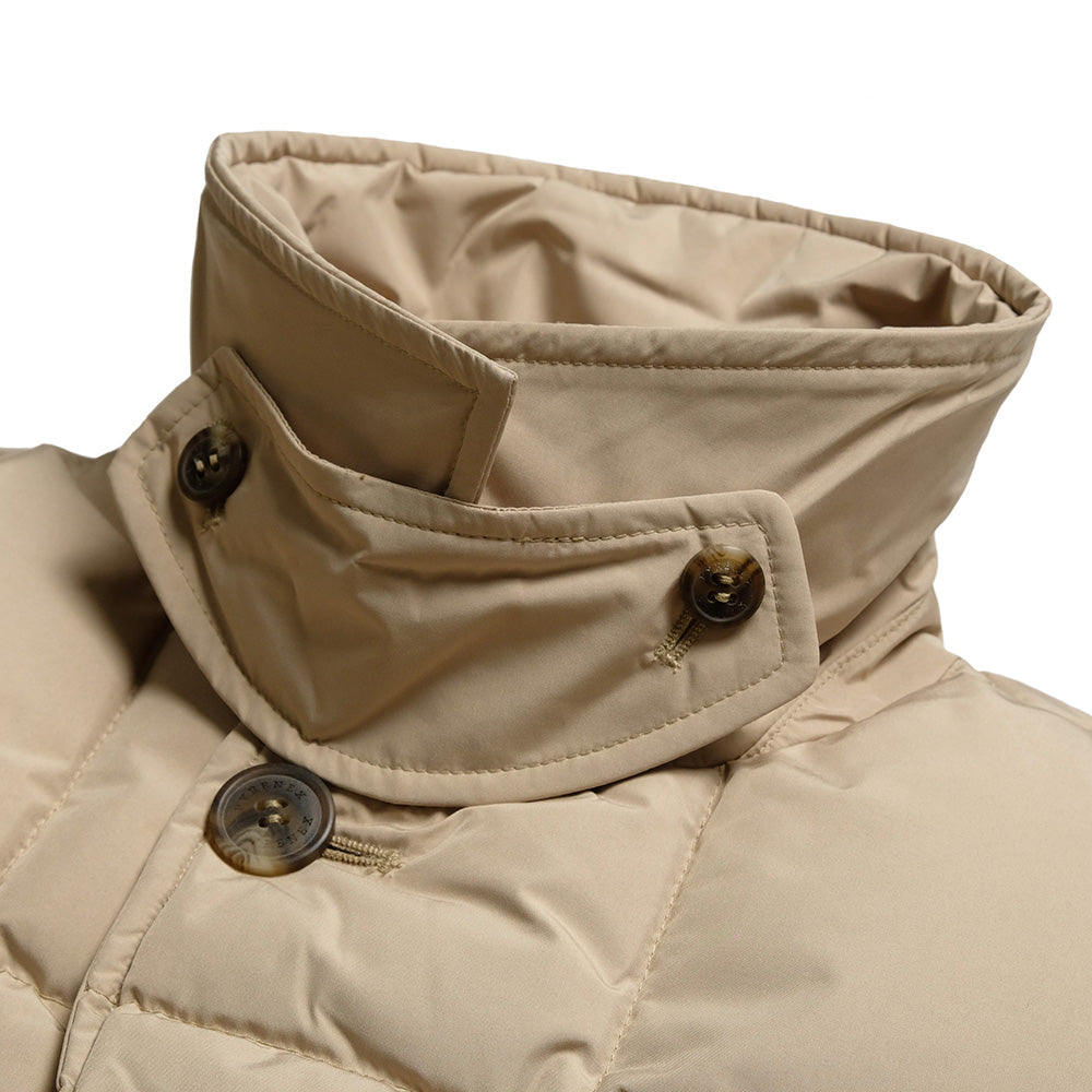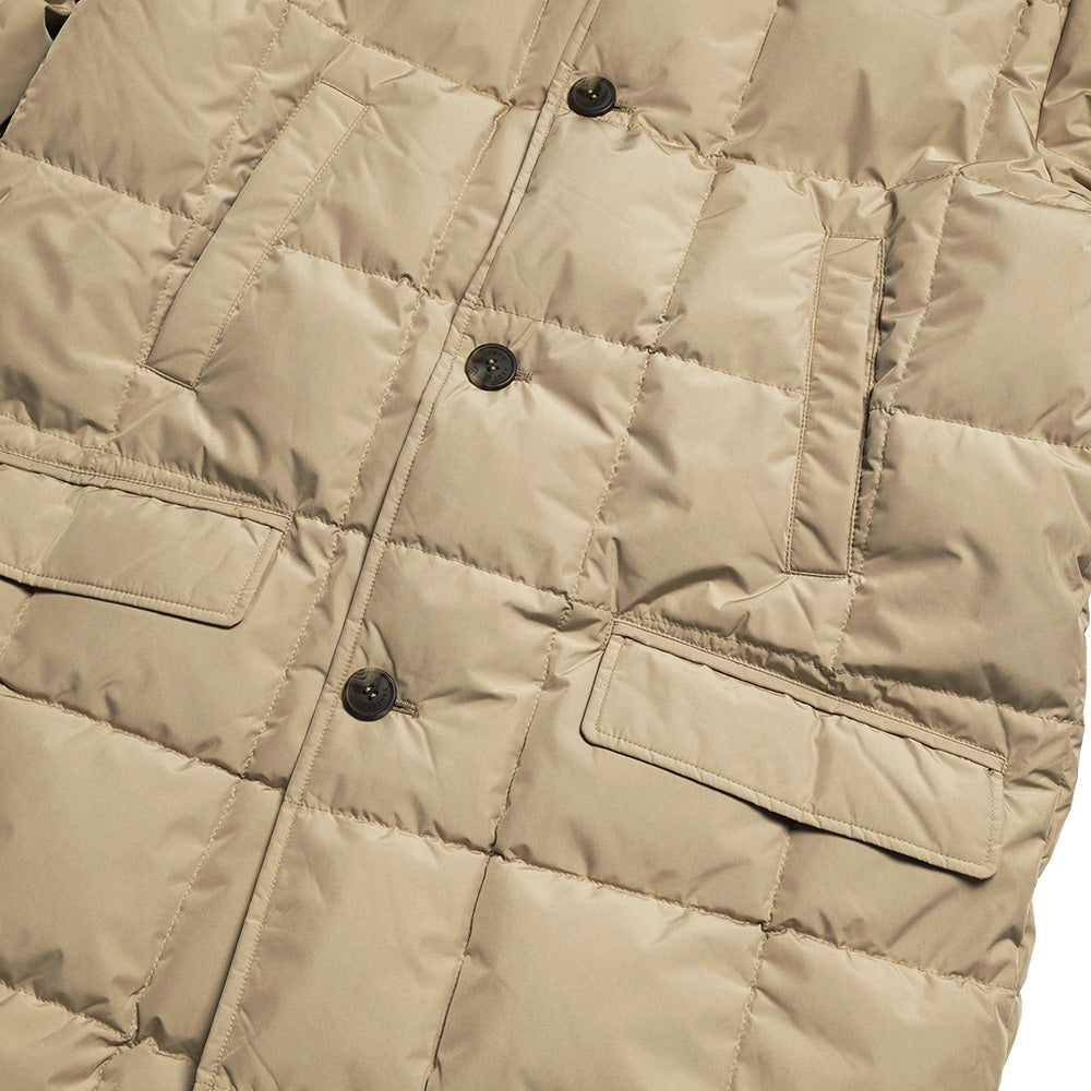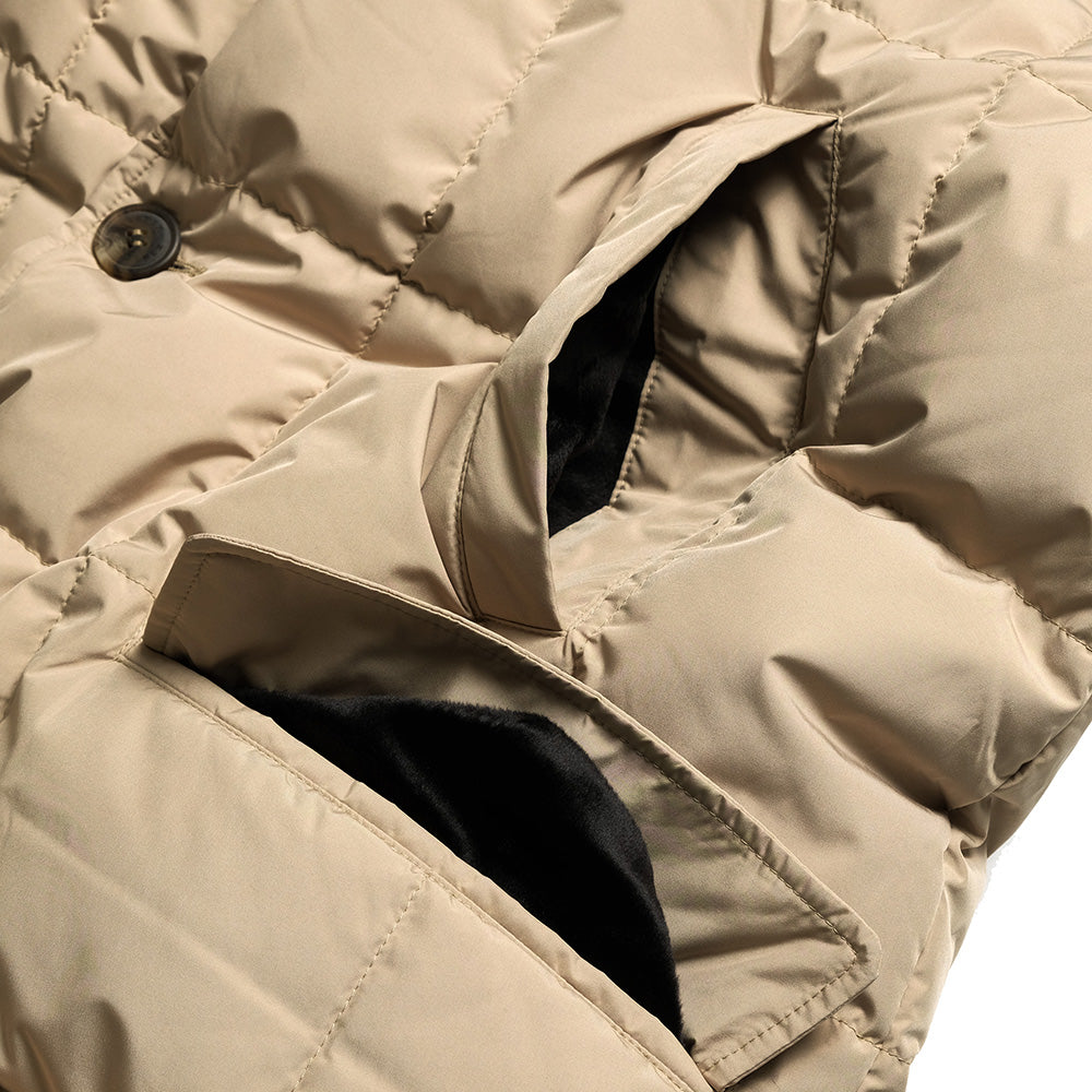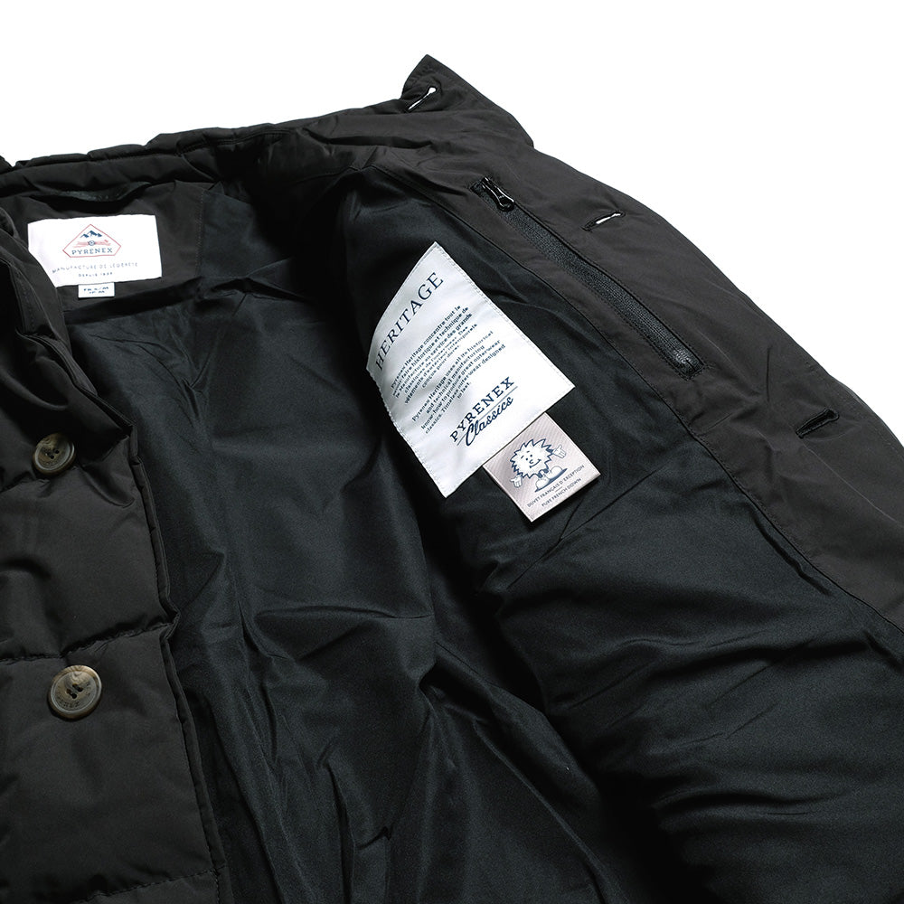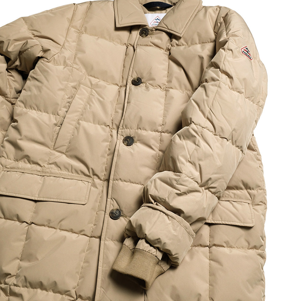 「グラーヴ」はピレネックスのコレクショでは初めてのリリースとなるステンカラーコートをデザインソースとしたダウンジャケット。クラシックなムードを匂わせるフロントボタン仕様で、実用的で汎用性が高いデザインはオンオフ兼用で着用可能。スーツやジャケットの上から着てもストレスを感じないように肩回りや袖のパターンは立体的にし、着丈も十分な長さをキープしています。チェストに配したハンドウォーマーポケットは、肌触りの良いフリースライニングを採用。襟裏にはチンストラップがあり、コートらしく襟を立たせることで首元の冷気を防いでくれます。
