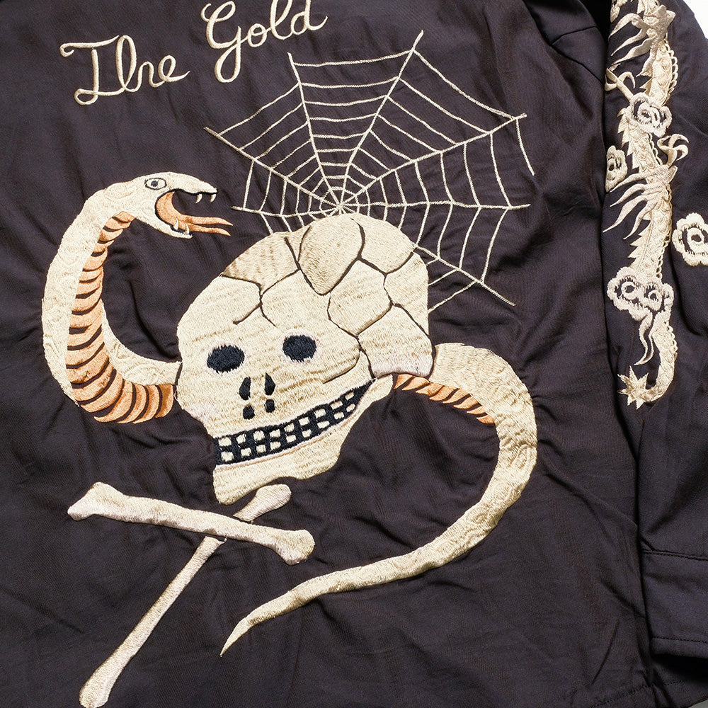 Based on a Vietnam jacket pattern, this jacket is embroidered with a skull and crossbones, which is rare even among vintage jackets. The rayon-blend cotton twill is treated with an aging process to give it a supple texture and drape. The evenly faded fabric and embroidery threads create a vintage look and feel.