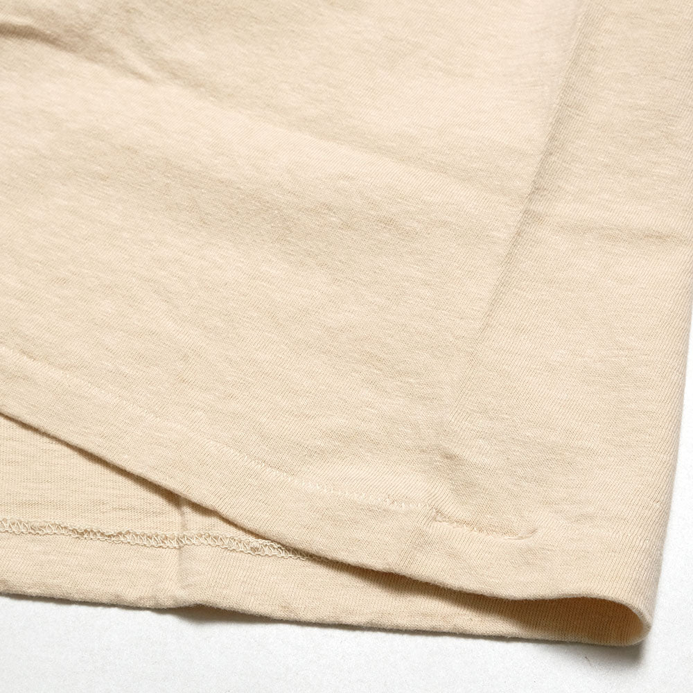 This printed T-shirt from BURGUS PLUS has a vintage-feel design and fabric. The loop-wheeled body is made of recycled cotton. The recycled cotton slub yarn, which is made by collecting the waste cotton generated when spinning yarn at a spinning mill and re-spinning it, is soft and dry to the touch. The body has no side seams, and the collar has a binder neck with three-needle stitching, and the sleeves and hem are made using the sewing method seen on vintage T-shirts, which is a traditional production method that takes a lot of time and effort. The design image is “Airplane Culture in the 1920s”. This was a time when airplanes were widely used not only for military purposes, but also for air mail, air passengers, sightseeing flights, and advertising for private companies. The motif is a stuntman who was active at a time when people were still skeptical about the safety of airplanes. BURGUS PLUS has made this T-shirt, paying tribute to these men who enlivened customers and greatly developed the airline industry.