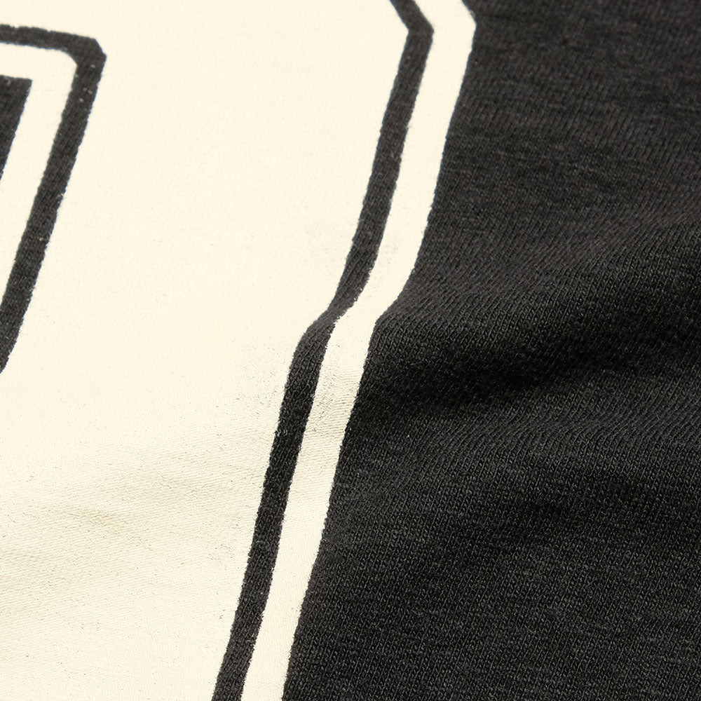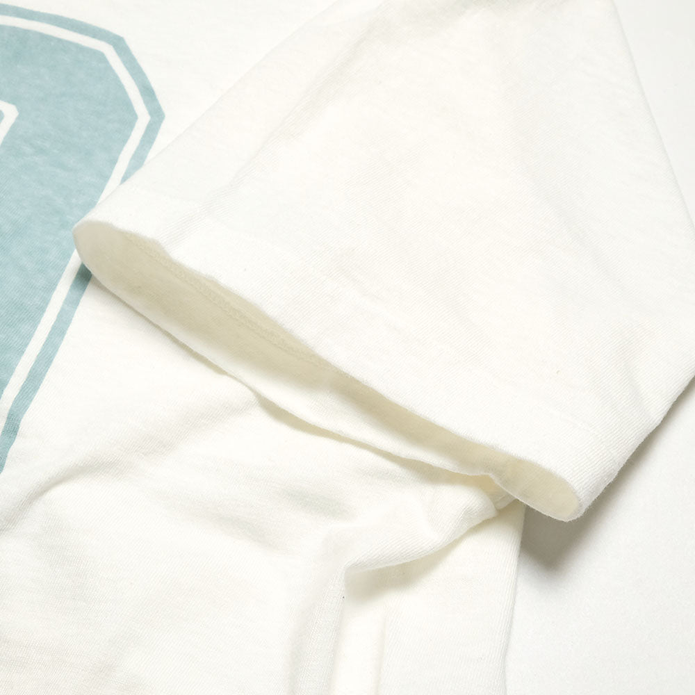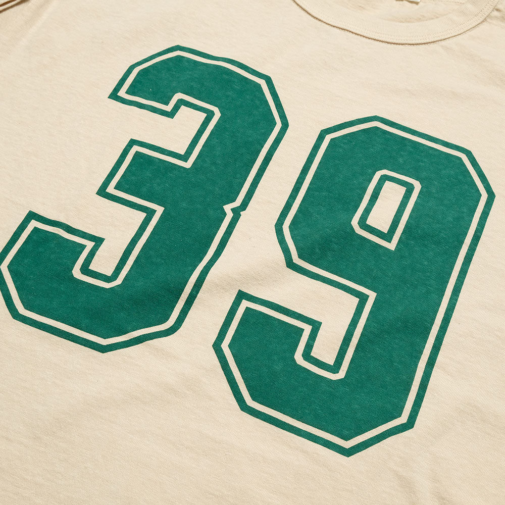 This printed T-shirt from BURGUS PLUS has a vintage-feel design and fabric. The loop-wheeled body is made of recycled cotton. The recycled cotton slub yarn, which is made by collecting the waste cotton generated when spinning yarn at a spinning mill and re-spinning it, is soft and dry to the touch. The body has no side seams, and the collar has a binder neck with three-needle stitching, and the sleeves and hem are made using the sewing method seen on vintage T-shirts, which is a traditional production method that takes a lot of time and effort. The 39 number print has been made several times by BURGUS PLUS. The number 39 also sounds like "Thank you!" in Japanese.