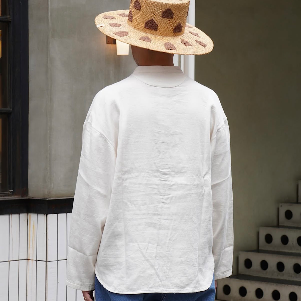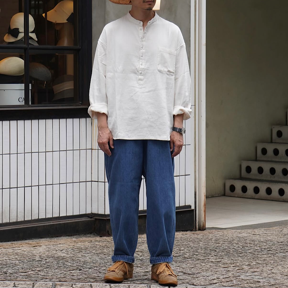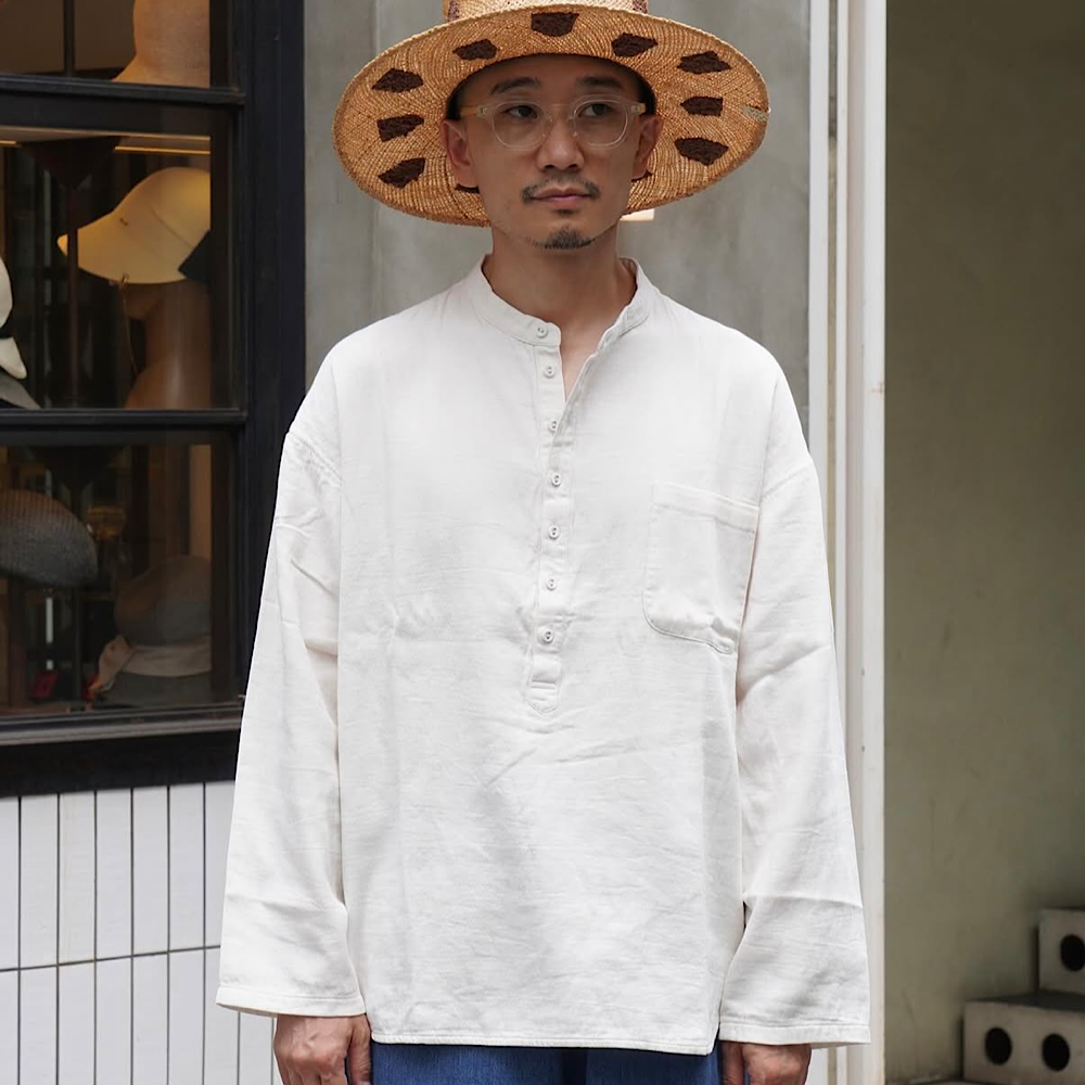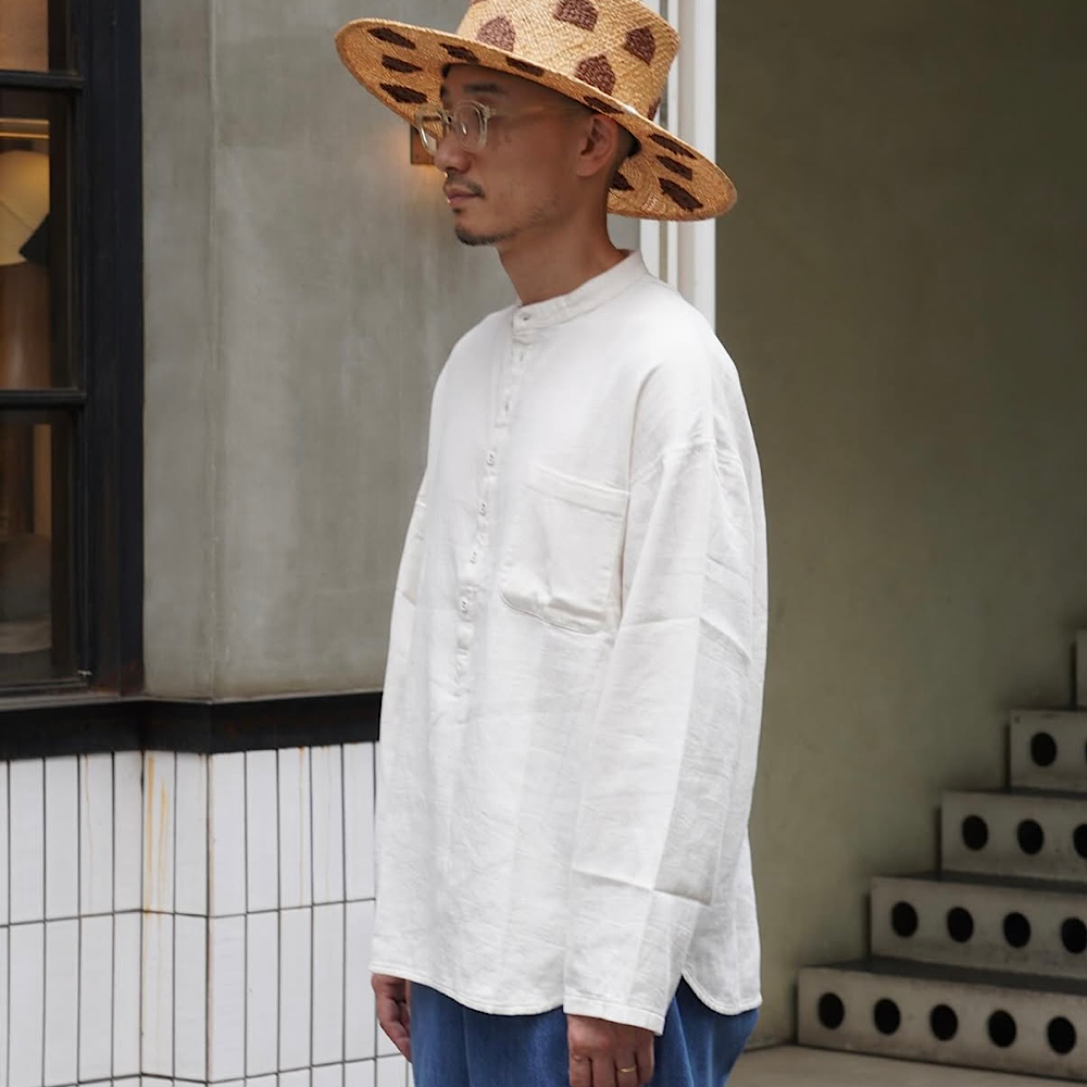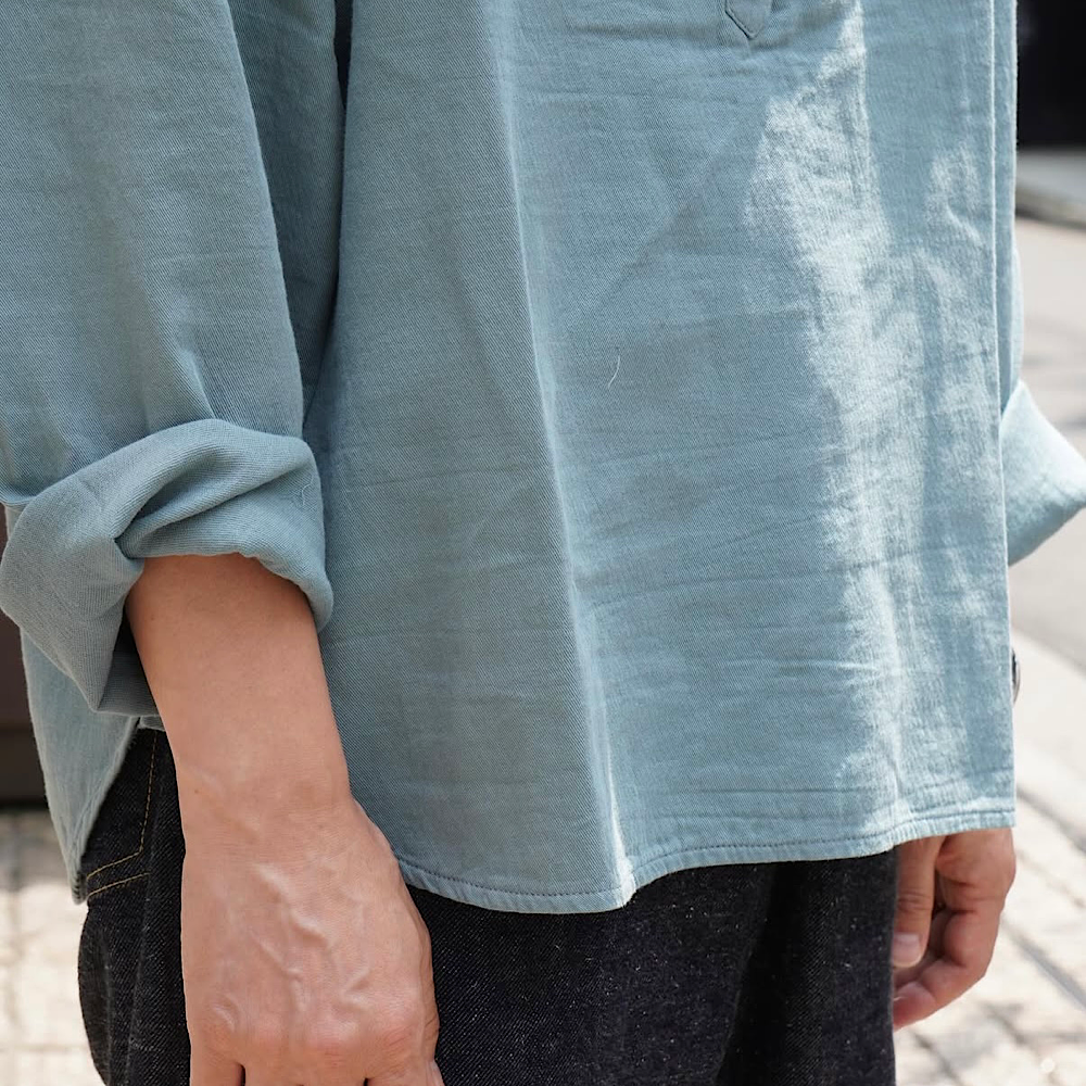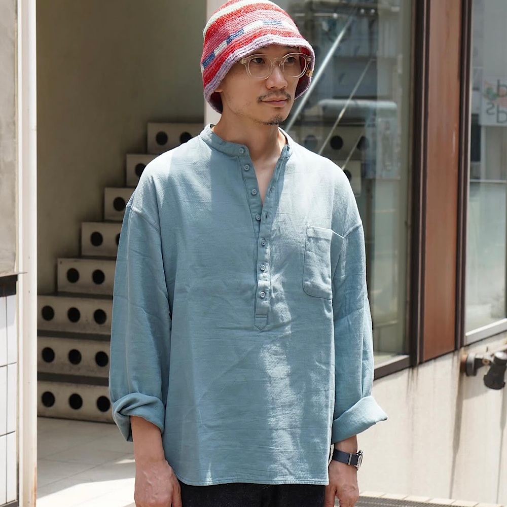 The Charcoal Henry pullover shirt, designed like a Henley neck T-shirt, is released again this season. It is made of cotton fabric with moderate thickness. The outside of the fabric is a glossy twill, and the lining is a soft, gauze-like double weave. It features a soft look and comfort. The shoulder area is sewn with a flat seamer sewing machine, like T-shirts. This long-sleeve shirt combines the best elements of both shirts and T-shirts, unique to the "EEL". It features a relaxed drop-shoulder silhouette. It can be worn by itself or as an inner layer.
