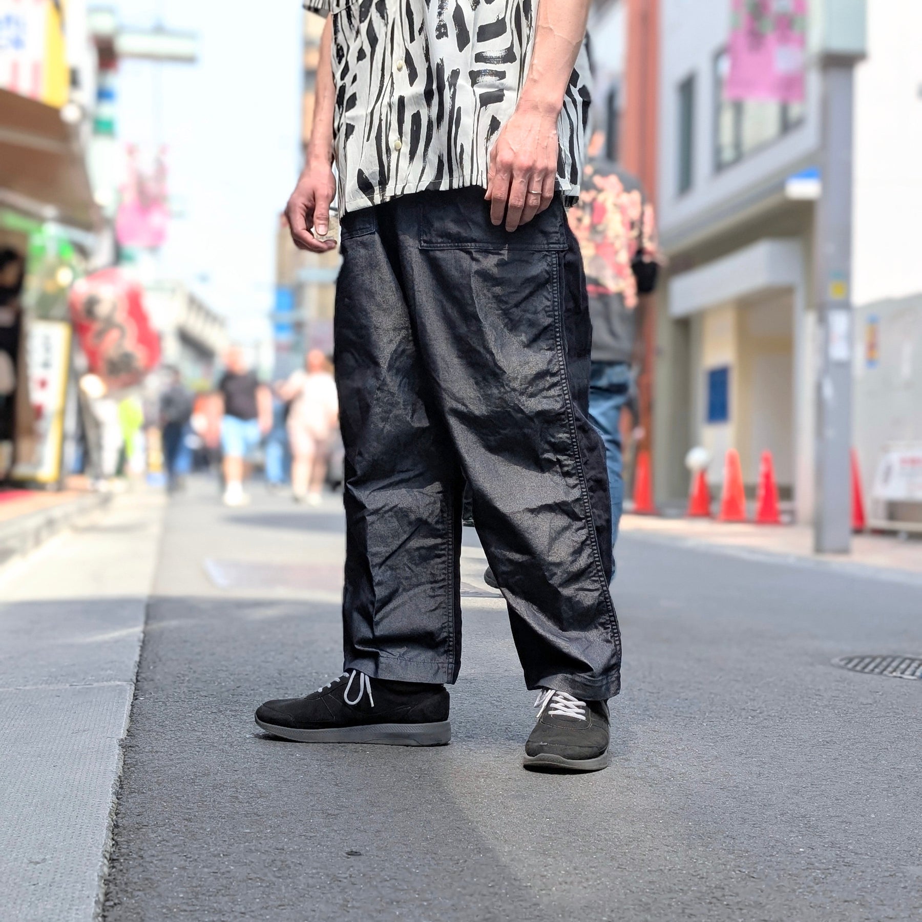 The pants combine different materials at the front and back. The front is made of light-ounce denim with a sheen, and the back is made of linen-blend cotton duck fabric. The waist is elasticized and adjustable with a drawcord for comfort. The relaxed silhouette allows you to wear them in a casual mood.