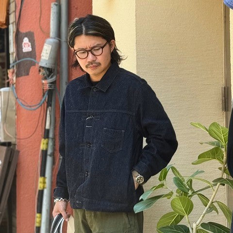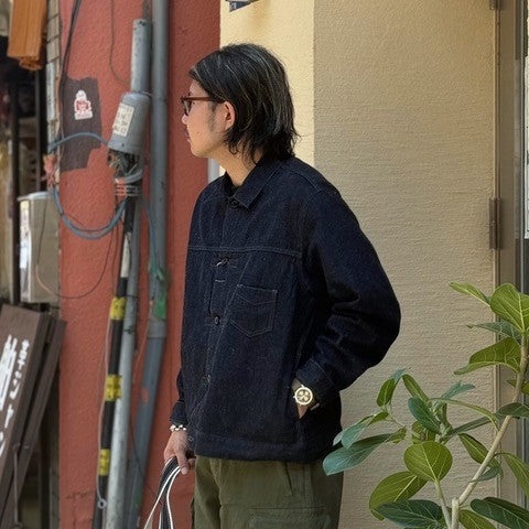 Designed based on the French Navy's work shirt jackets in the 1950s and 1960s. Made of OUTIL's original indigo fabric, woven with warp yarns rope-dyed with natural indigo and weft yarns of cotton and hemp blends.