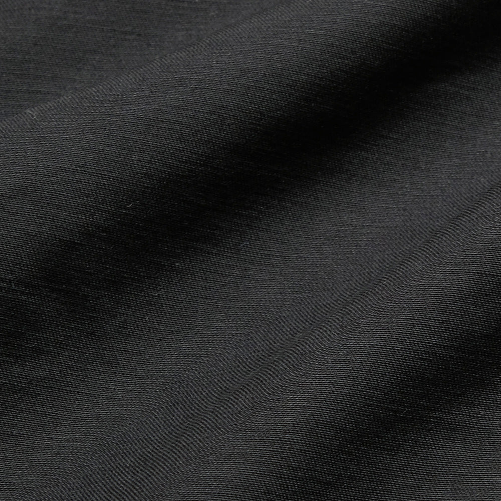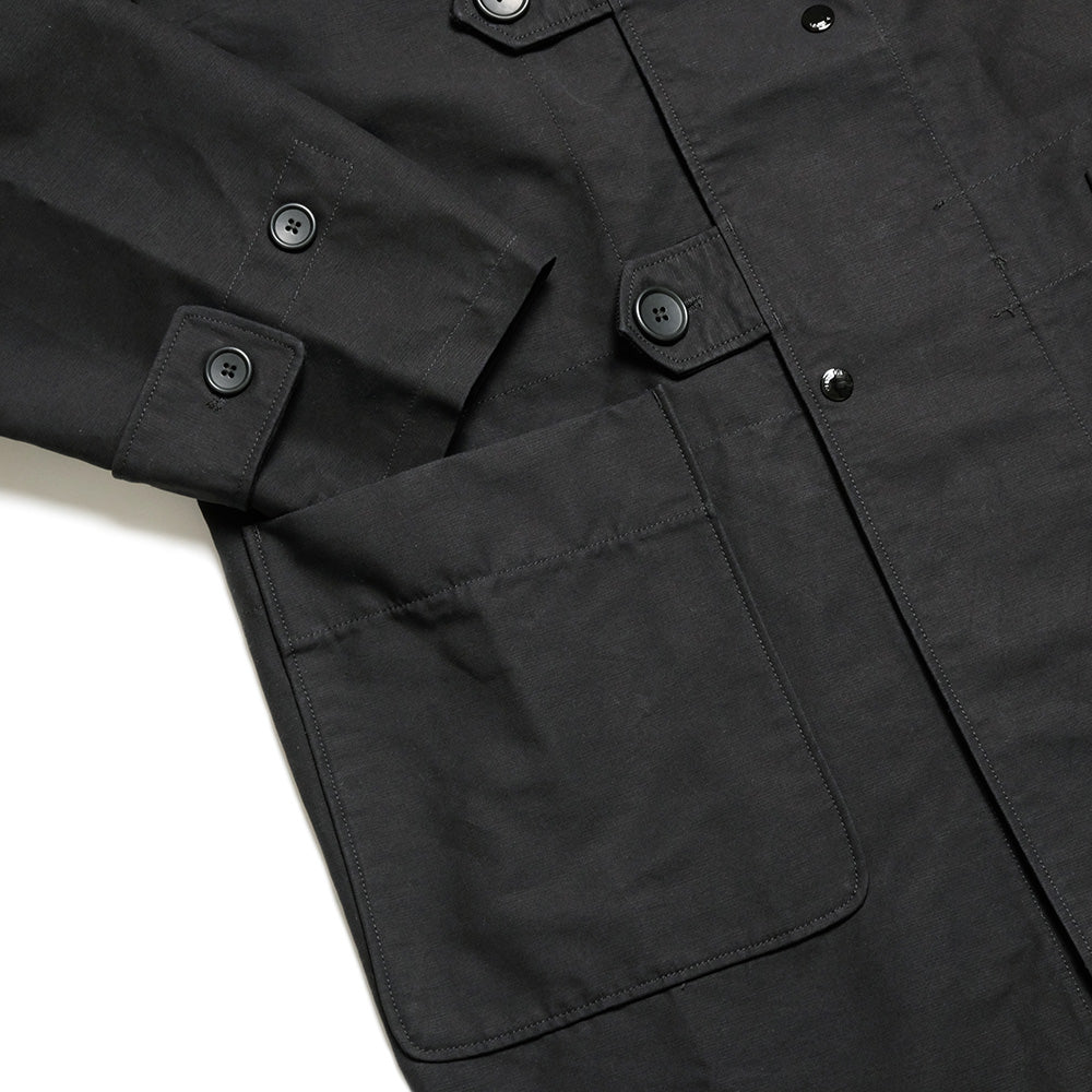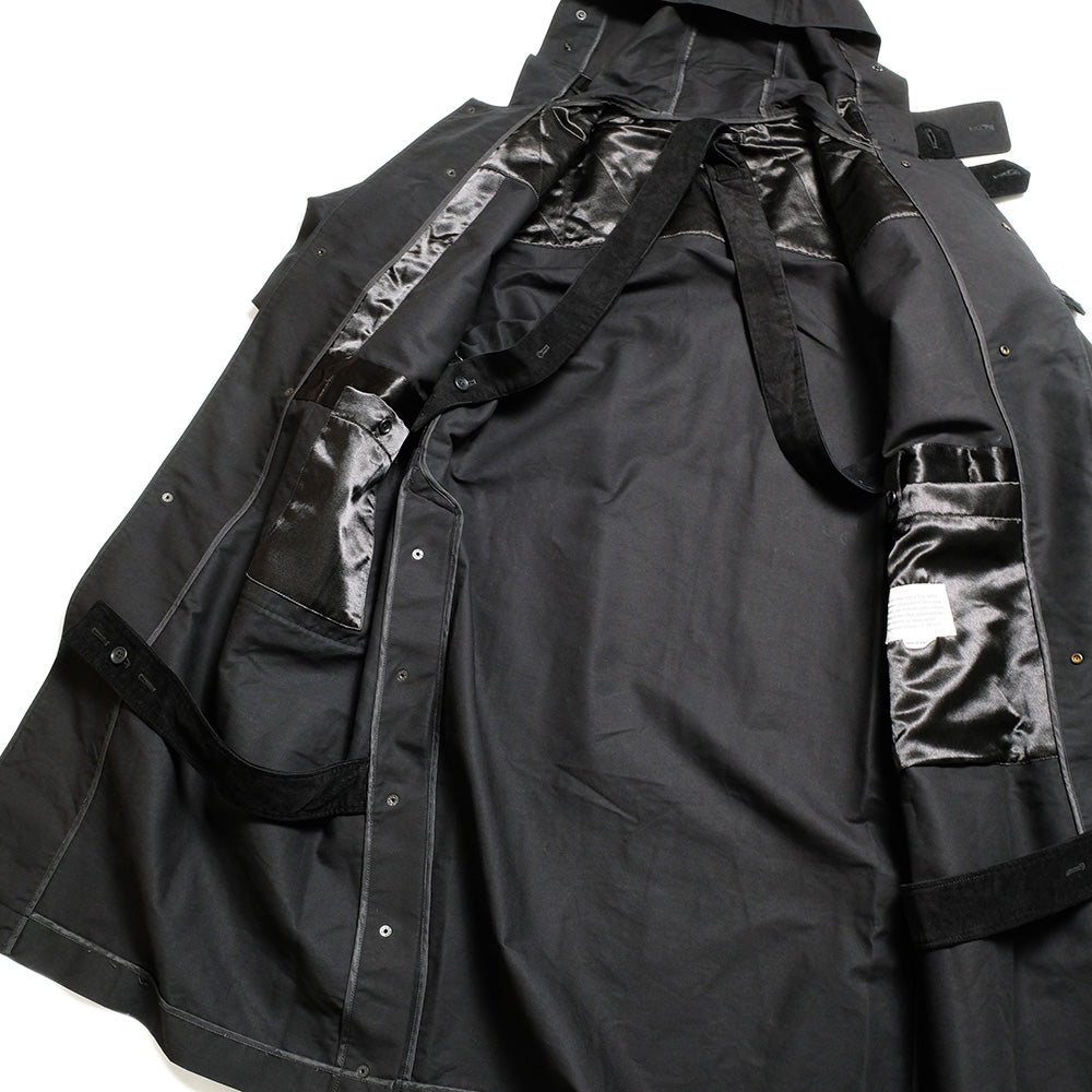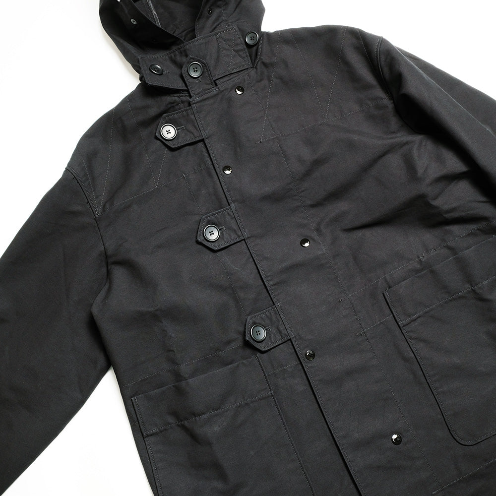 The duffle coat from Engineered Garments, a standout item in this collection, features a longer length than previous versions, evoking the maxi-length coats and morning coats that are iconic in New York. It is made of thick, stiff cotton double-cross fabric, accentuating its distinctive silhouette.