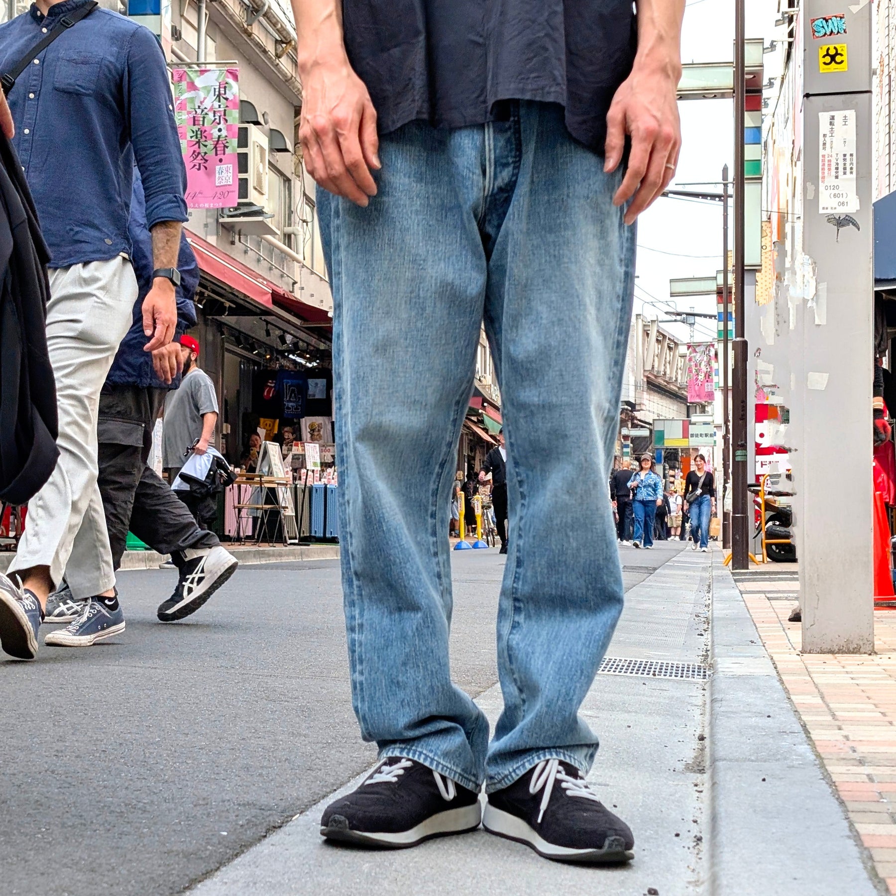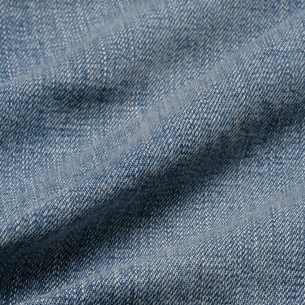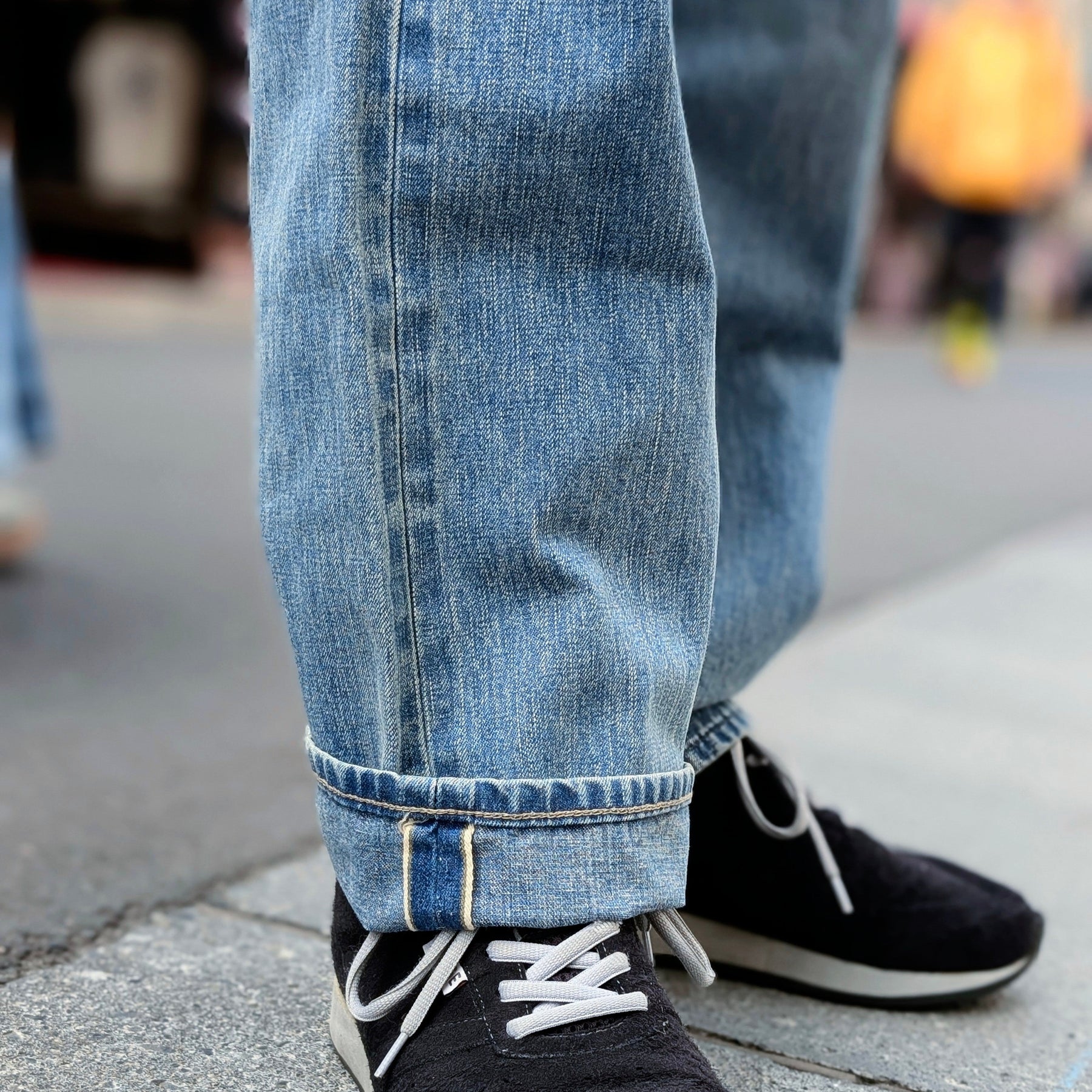 These five-pocket pants are unbalanced with the back by making the front extremely small. The warp is rope-dyed with natural indigo, and a cotton/hemp blend is used for the weft. Faded blue-colored jeans with the brand's original processing. With its relaxed silhouette, this pair is recommended all year round. The washed finish makes them a familiar look and feel from the moment you start wearing them.