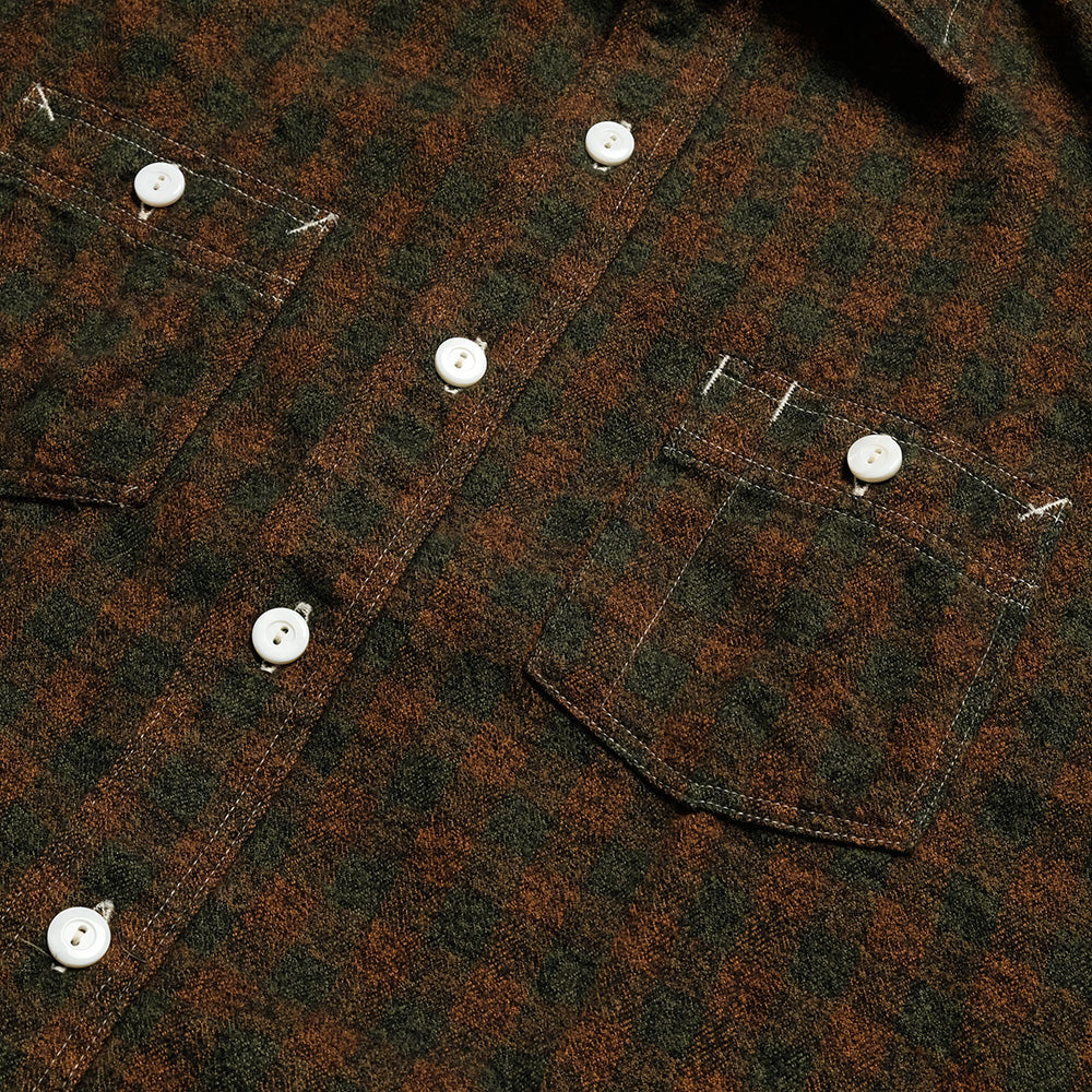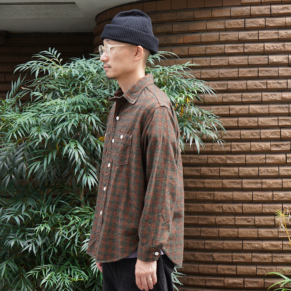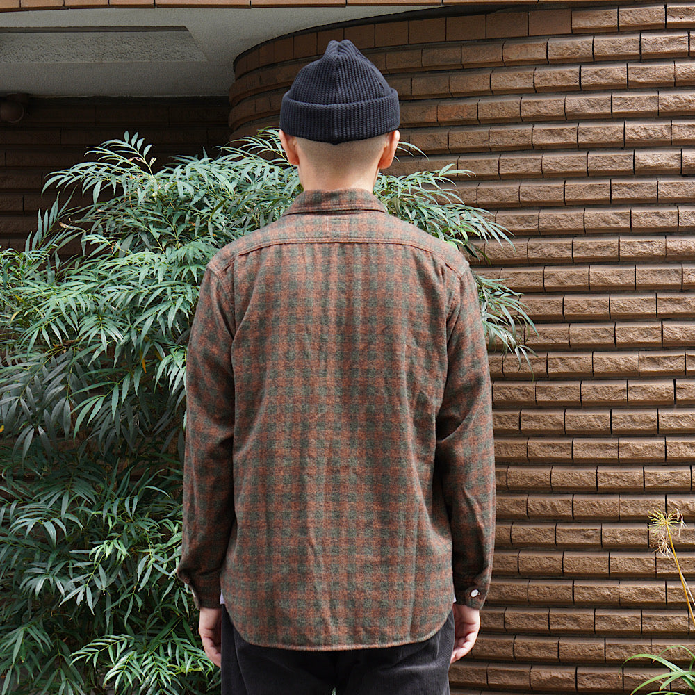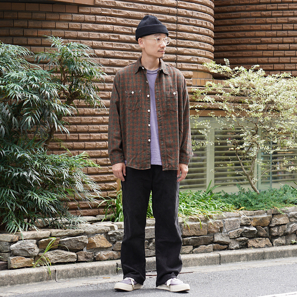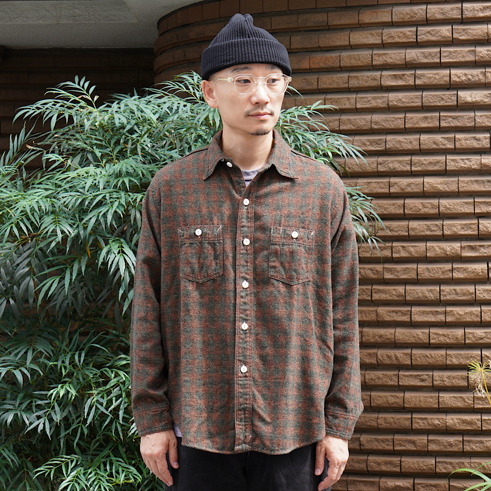 This long-sleeved shirt is an updated version of a simple two-pocket chambray shirt, based on the vintage shirt that the designer has owned since the 1980s, which was issued to firefighters at the St. Louis, Missouri, fire station around the 1930s. It features a basic design incorporating classic details of vintage work shirts, such as a chin strap at the neck, a pen pocket on the left chest, and gussets at the hem on both sides. Made from 100% cotton for a fluffy feel.