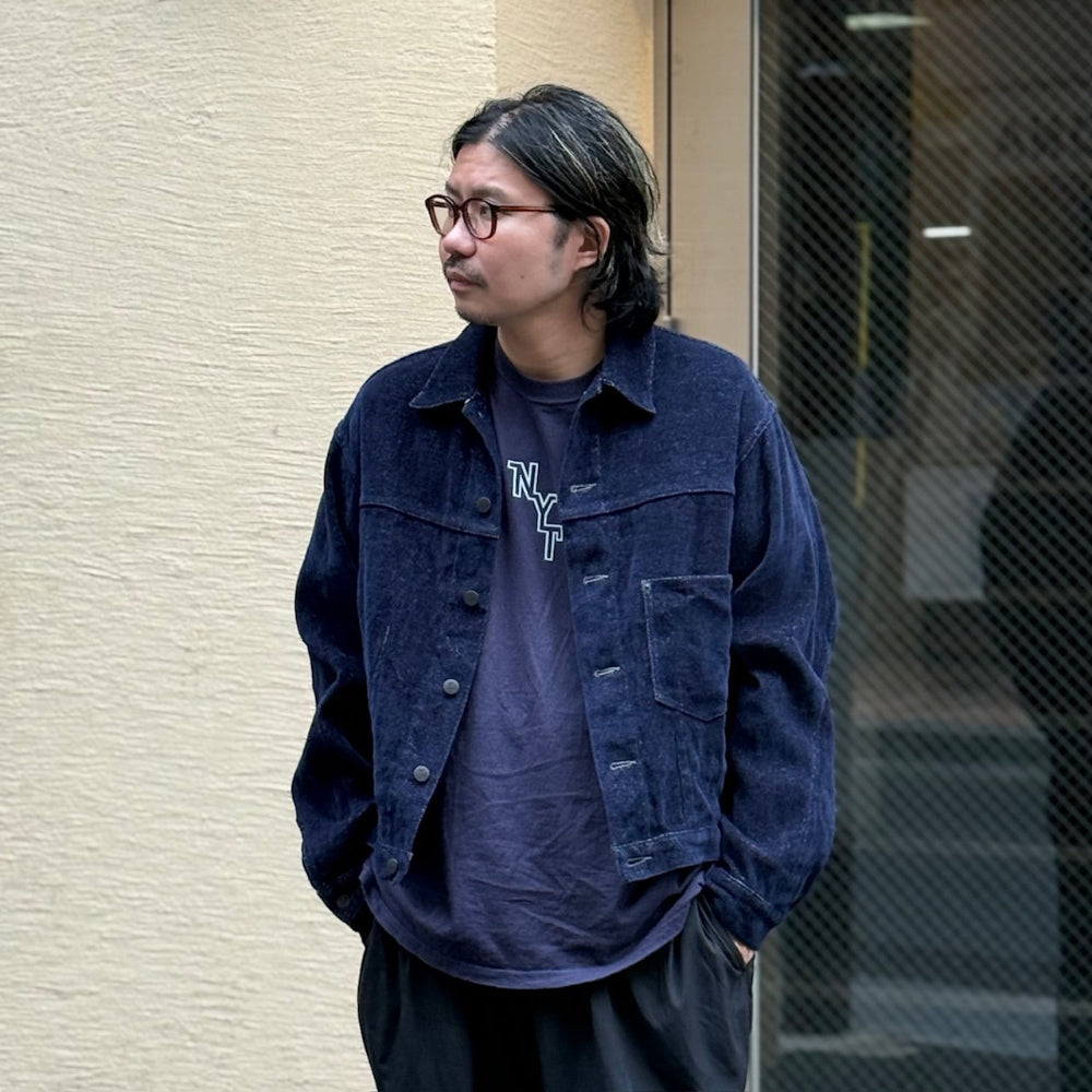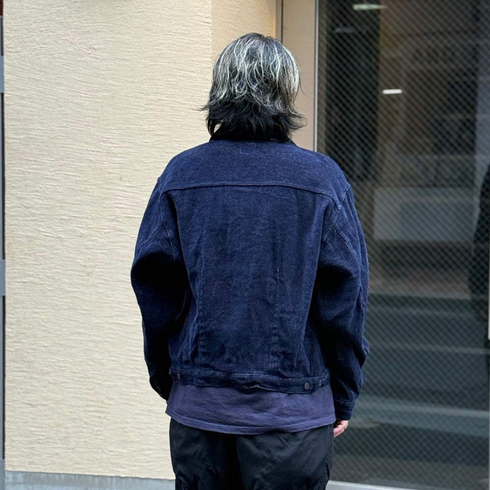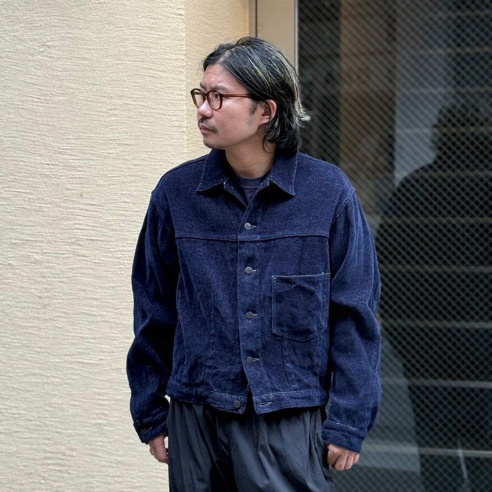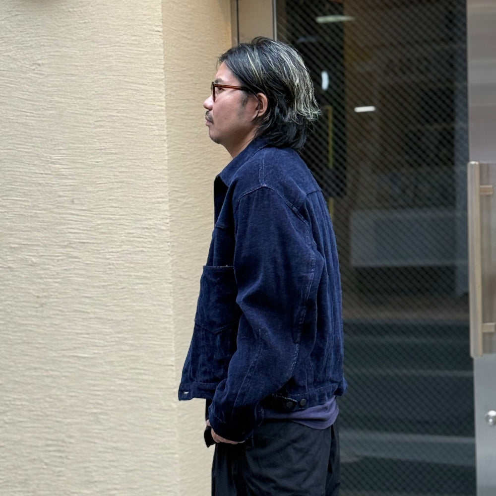 Based on an authentic denim jacket design, darts at the front and back hems create a unique silhouette. This item features a voluminous silhouette with a three-dimensional, puffed-out effect on the main body. The fabric is a unique blend of cotton and Washi (Traditional Japanese Paper). Chenille weaving gives it a three-dimensional, soft texture, and the breathability and absorbency typical of Washi paper provide exceptional comfort.